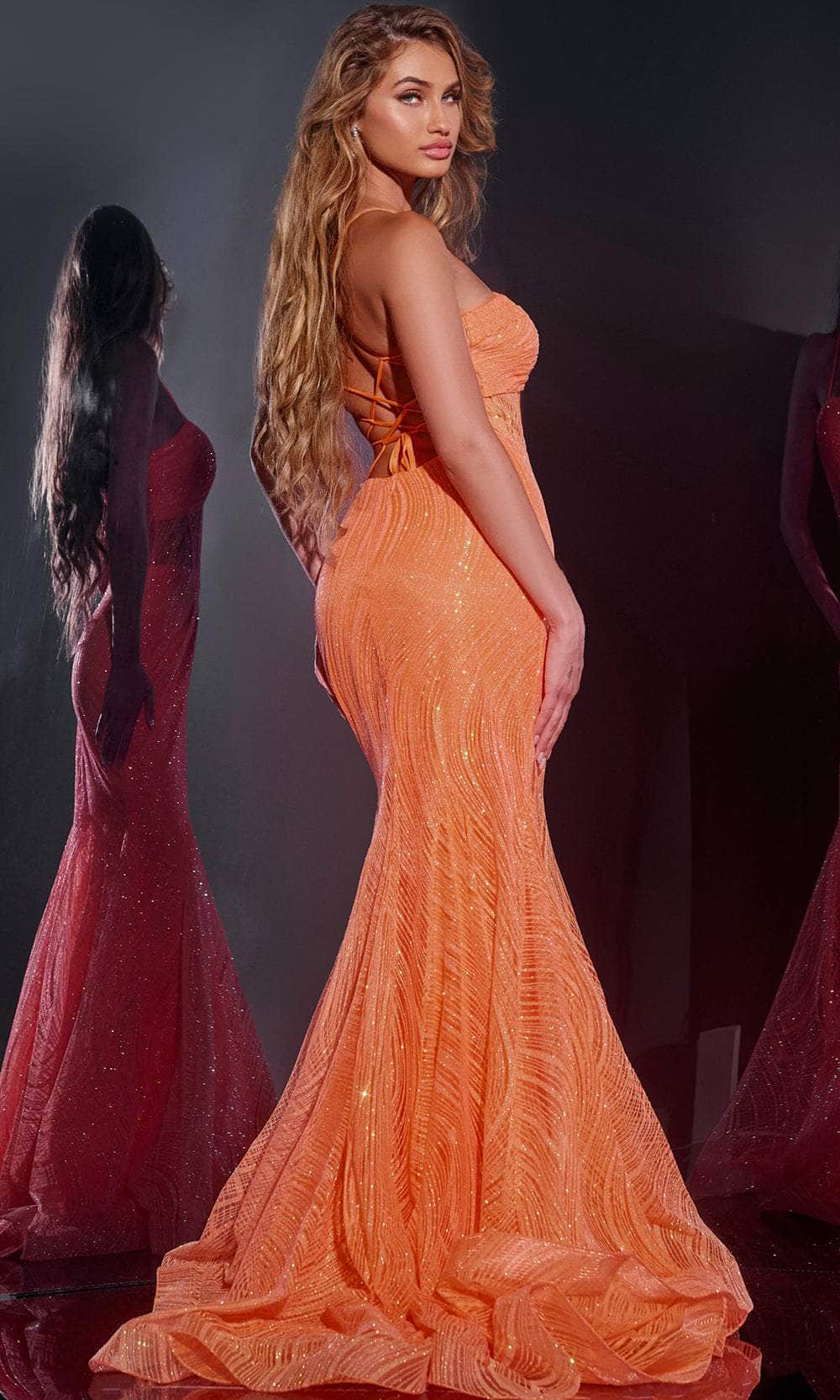 Dazzle the crowd in Jovani 44208, an exquisite gown covered in shimmering sequins that create a radiant allure. This stunning design features delicate spaghetti straps and a structured corset bodice that enhances your silhouette. The lace-up back adds a touch of elegance and ensures a perfect fit, while the floor-length mermaid silhouette gracefully extends into a dramatic train. Complete with a convenient back zipper, this Jovani 44208 is ideal for making a striking entrance at any formal event. Model is wearing Orange color.