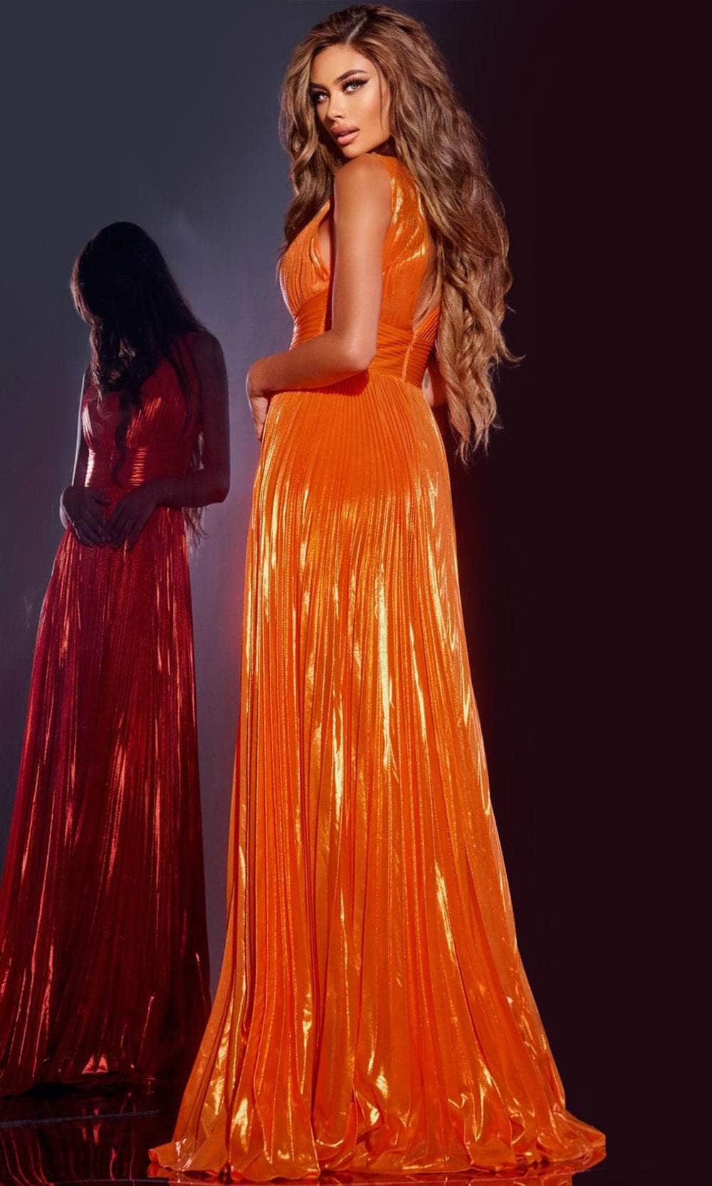The Jovani 44230 gown is a masterpiece of elegance, showcasing a flowing A-line design that sweeps the floor with grace. A deep V-neckline lends a bold touch to the look, while wide straps ensure both comfort and style. Pleating throughout the gown adds texture and depth, making it a showstopper at any event. The dramatic high slit adds an element of intrigue, giving this gown an irresistible combination of allure and sophistication. Step into luxury with the Jovani 44230 gown. Model is wearing the Orange color.