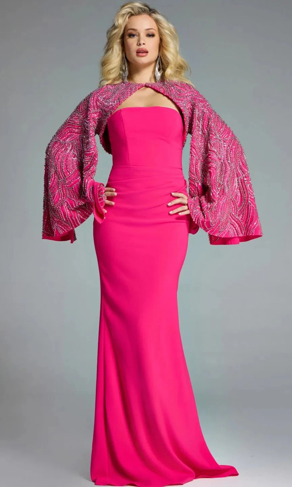Unleash modern glamour in the Jovani 44254, a dramatic evening gown that redefines statement style. This design features a clean strapless cut and straight-across neckline paired with a matching beaded embellished cape, creating a layered look full of texture and sophistication. The column silhouette hugs the body, elongating the figure and leading into a graceful floor-length hem. Perfect for upscale galas or red carpet appearances, the Jovani 44254 promises bold elegance in every step. Model is wearing Fuchsia color.