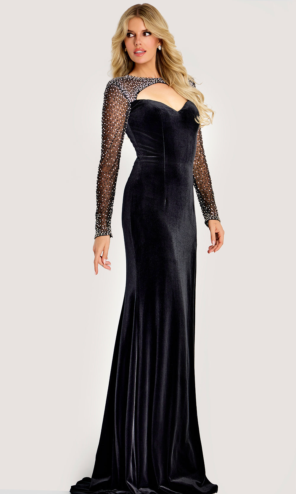 | Details: | Illusion Beaded Details, Cutout Front, Long Sleeves, Closed Back, High Slit, Fitted Bodice |