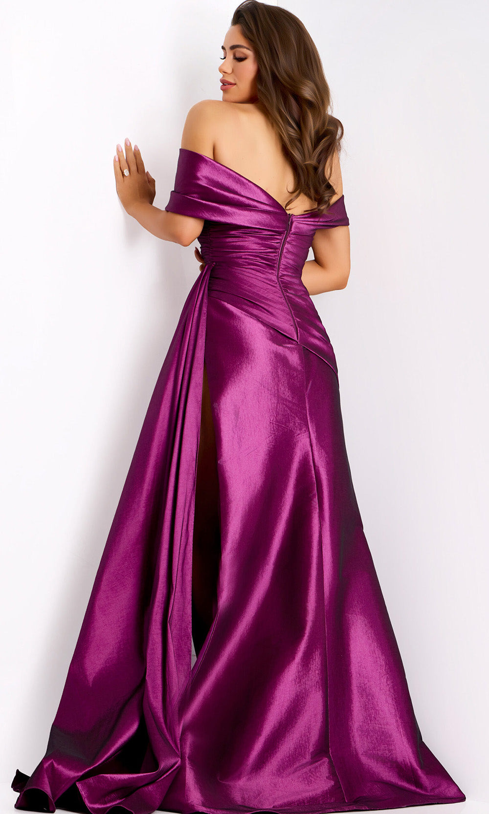 Experience captivating elegance in the Jovani 44322, a gown that merges refined styling with modern glamour. This long sheath silhouette showcases a flattering off shoulder neckline paired with a beautifully ruched bodice, creating an alluring fit that enhances natural curves. The high slit adds a striking focal point while offering graceful movement. A draped side sash and sweeping train brings a dramatic finish. Ideal for moments where sophistication is key, the Jovani 44322 offers a timeless aesthetic enhanced by luxurious shimmer satin fabric and meticulous attention to detail. Model is wearing Plum color.