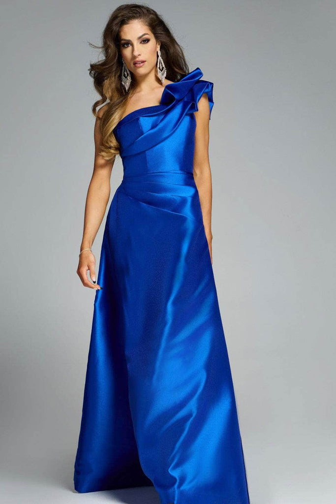 Make a memorable entrance with the striking Jovani 44345 masterpiece. This one shoulder gown stuns with an oversized ruffle accent that adorns the cap sleeve and asymmetric neckline, creating a statement look with dramatic flair. A softly pleated bodice cinches at the natural waist before flowing into a smooth A-line skirt, providing graceful movement. This floor-length design offers a structured finish that flatters all figures. Turn heads at your next event with the Jovani 44345, a striking blend of elegance and bold design. Model is wearing Royal color.