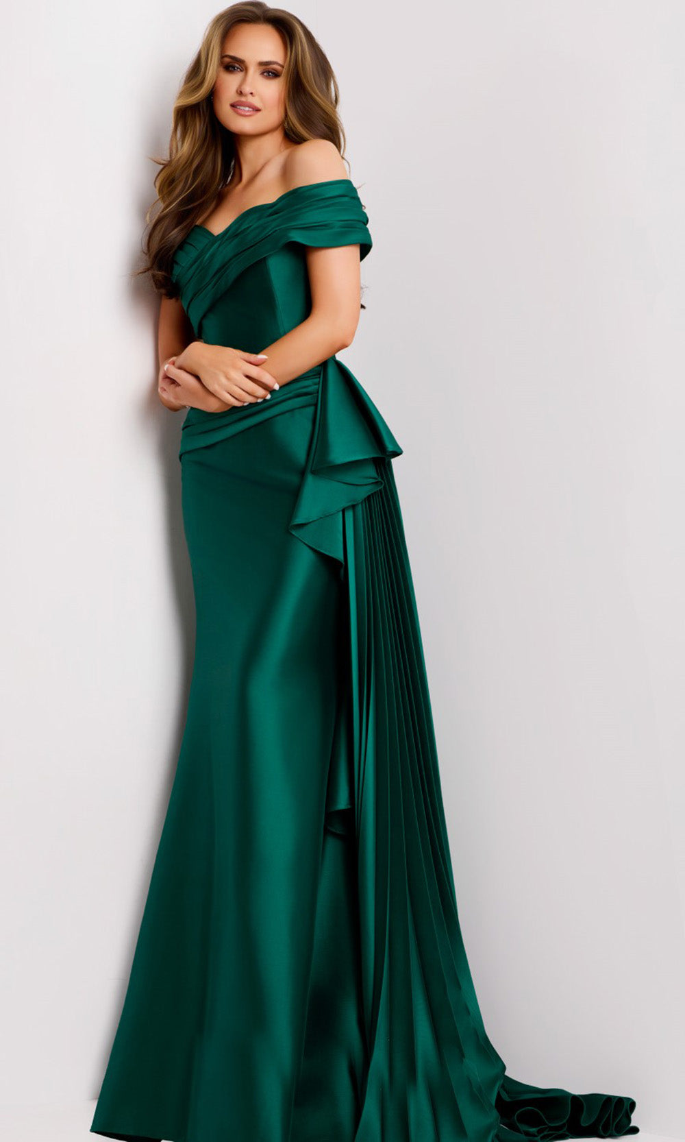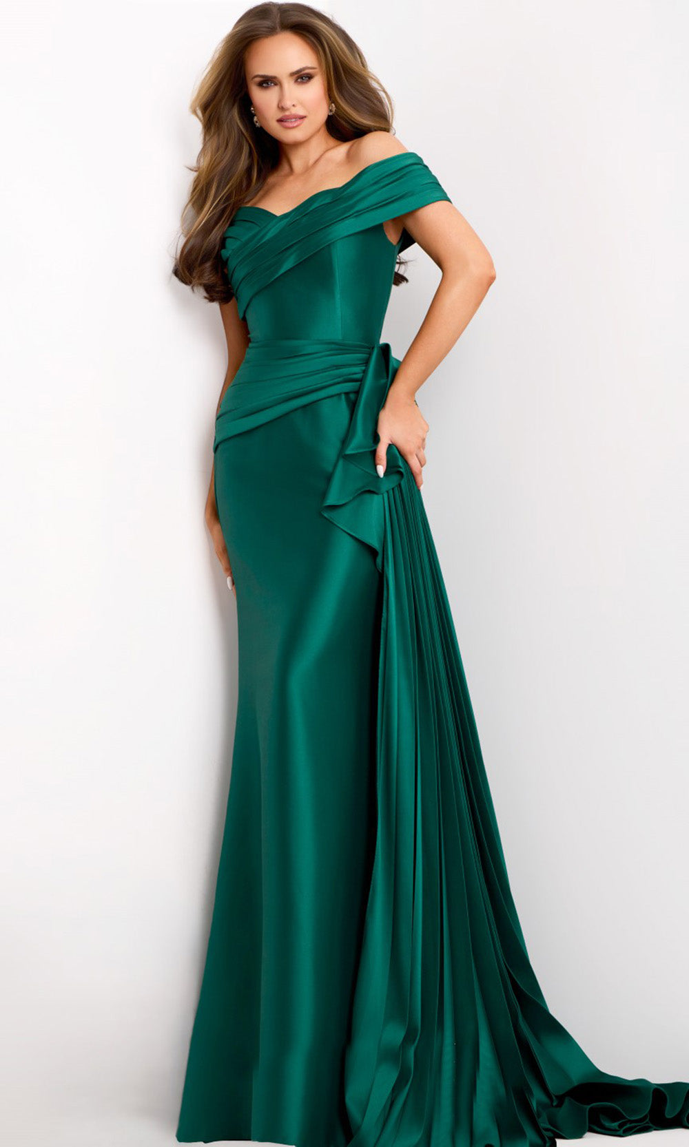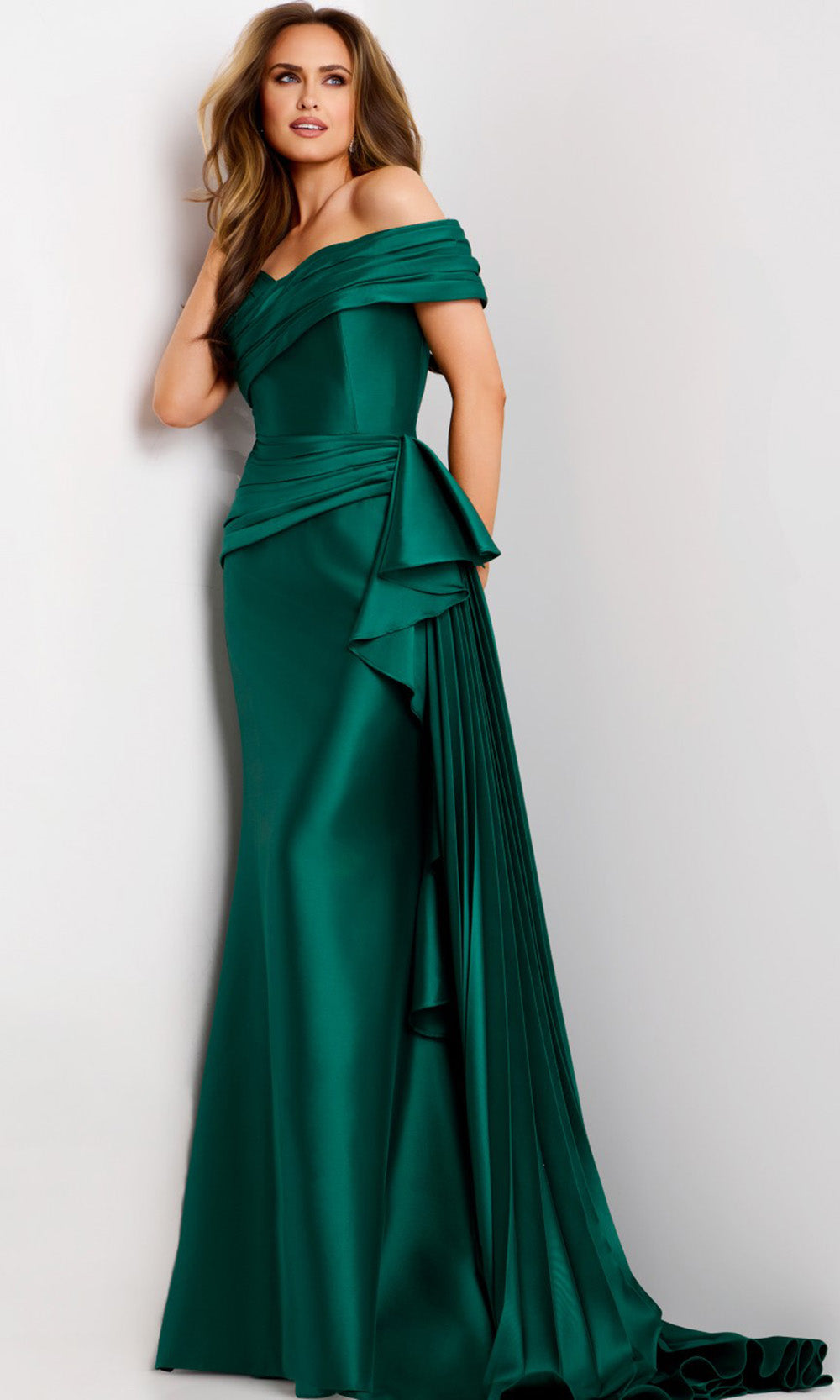 Elegance meets artistry in the Jovani 44524, a fitted gown that exudes timeless appeal. Its off-shoulder sweetheart neckline and short sleeves frames the collarbone gracefully, leading into a ruched bodice that enhances the waistline. A pleated side sash add dimension and a sense of movement, while the sweep train provides a stately finish. Perfect for formal occasions, the Jovani 44524 captures a harmonious balance of classic design and modern sophistication. Model is wearing Emerald color.