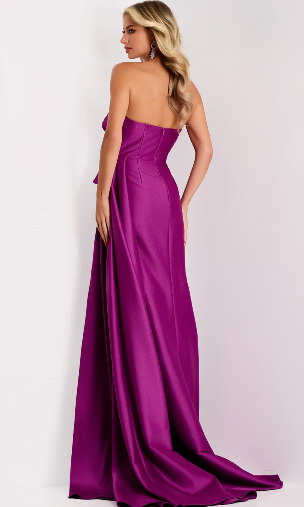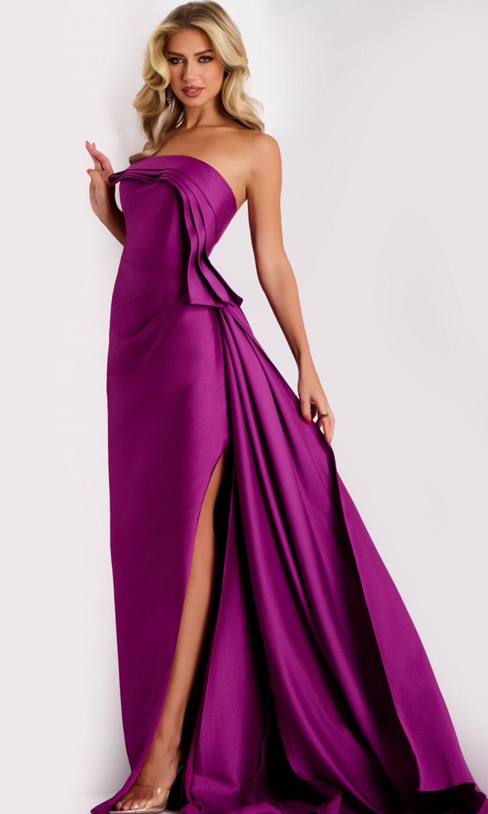 Bold elegance meets refined structure in this Jovani 44526 strapless evening gown, designed to leave a lasting impression. The straight across neckline offers a modern, clean frame for the shoulders, while the fitted bodice contours the figure. Cascading pleated ruffles flow diagonally across the sheath skirt, drawing the eye toward the daring high slit that adds movement and allure. Made in smooth satin for a luxurious drape, the Jovani 44526 is the perfect choice for those who want to combine sophistication with a touch of dramatic flair. Model is wearing Berry color.
