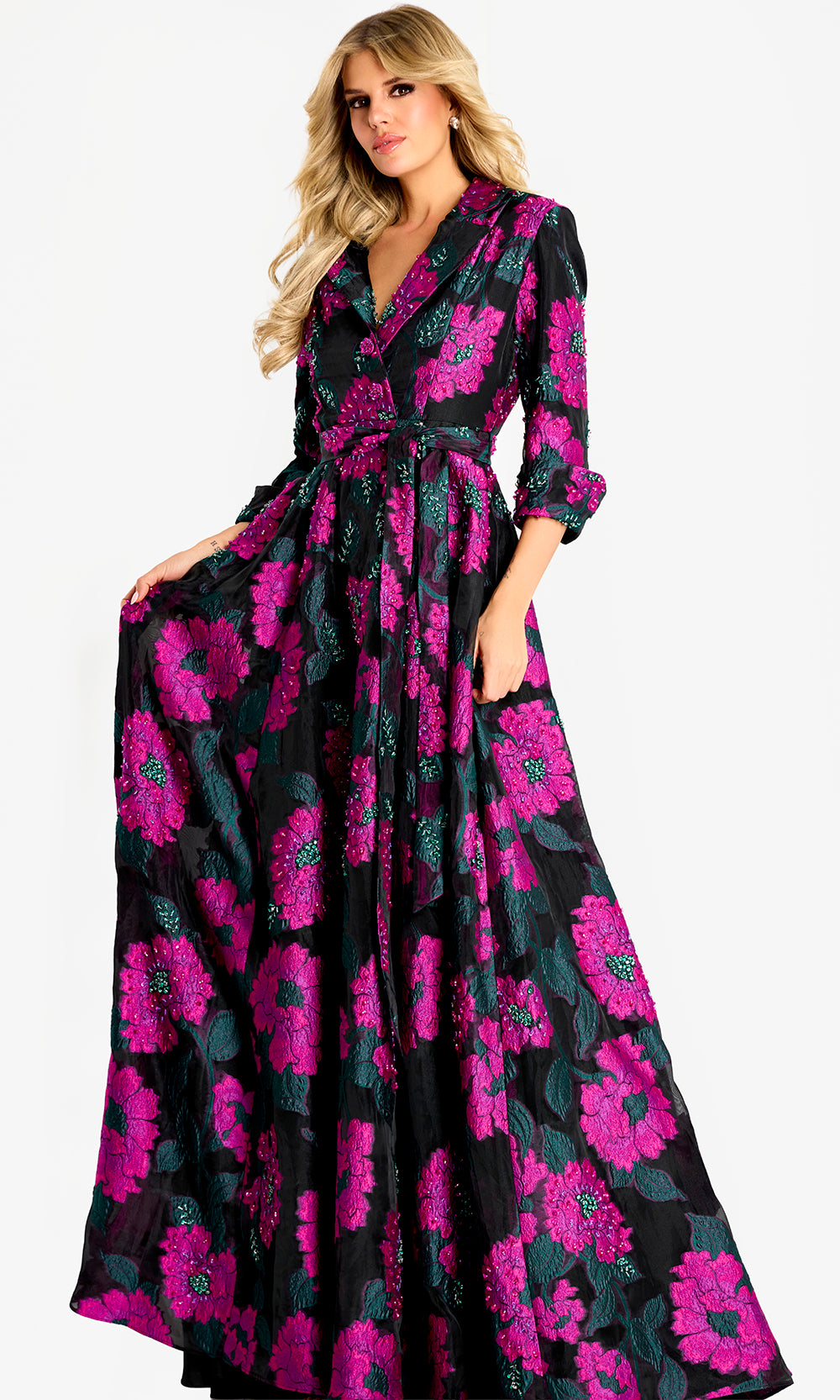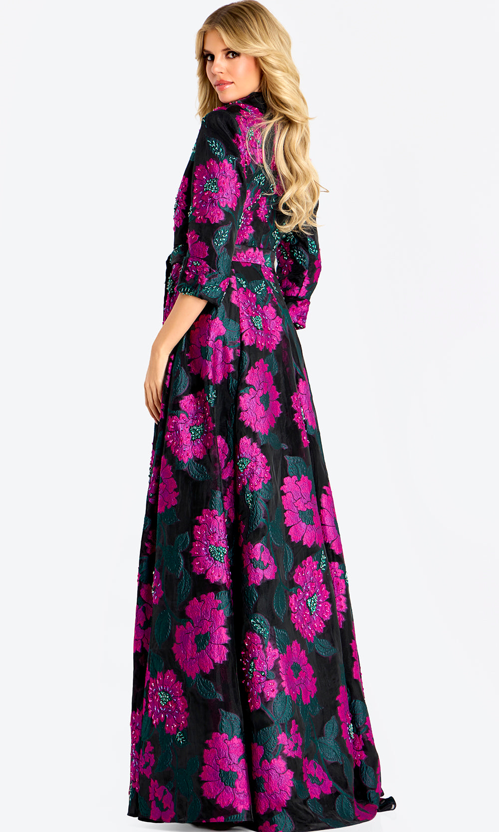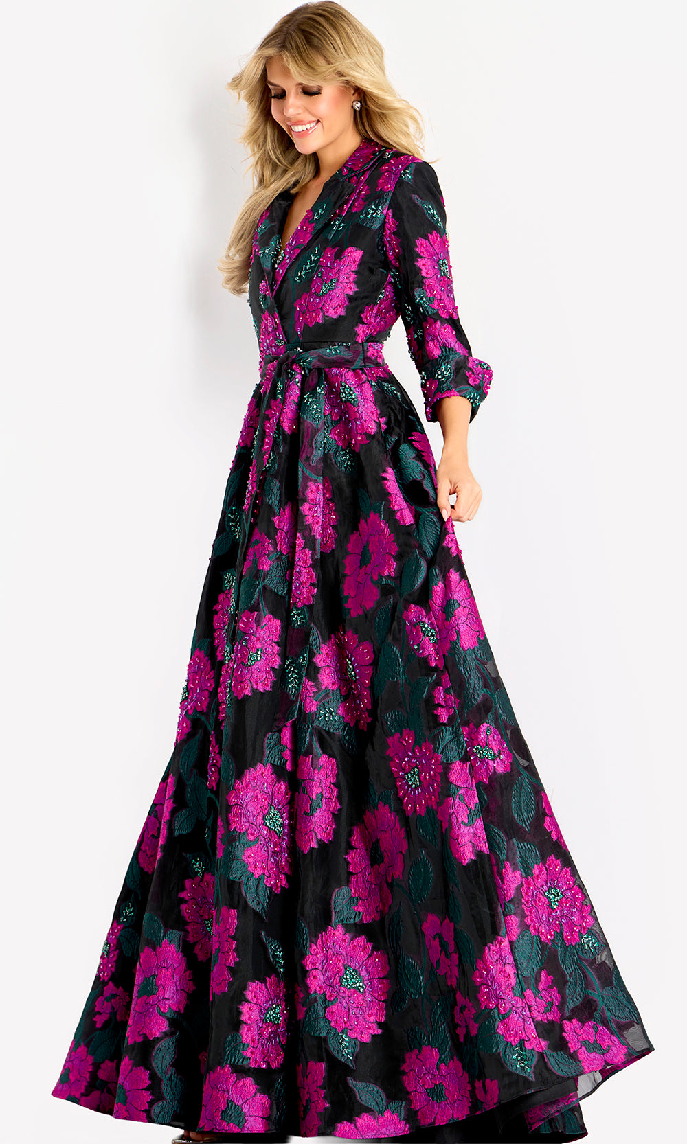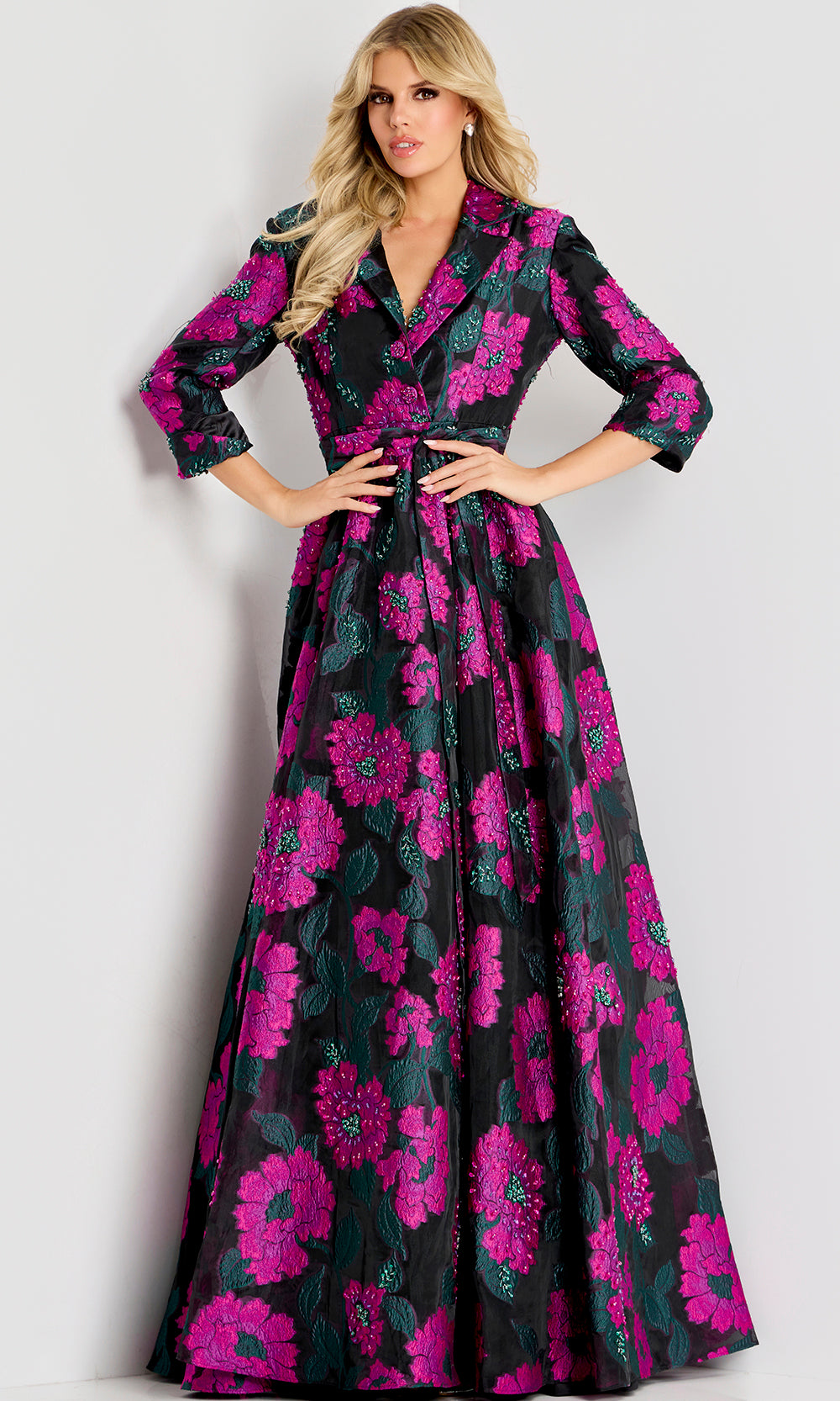 With commanding elegance and timeless appeal, Jovani 44716 defines refined sophistication for grand occasions. A collared v-neckline frames the face with polished distinction, while the three-quarter sleeves offer graceful coverage and tailored charm. The tie waist accentuates natural shape before flowing into a full A-line skirt that moves with dramatic poise. Subtle floral detailing adds dimension and artistry, elevating this piece into a masterpiece of structure and elegance. Jovani 44716 radiates confidence and couture grace. Model is wearing Multi color.