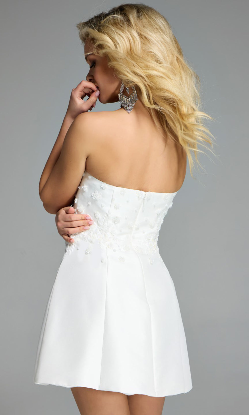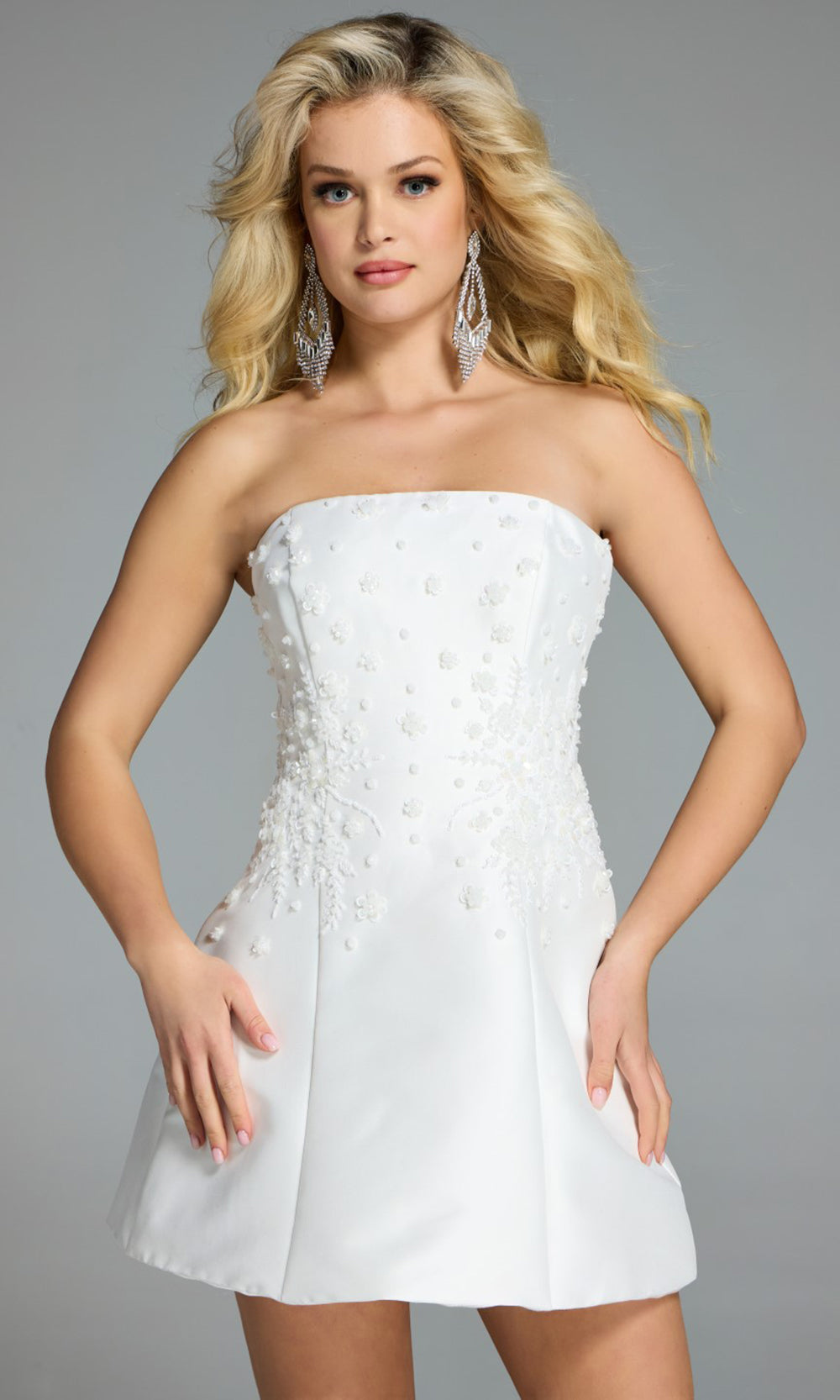 A celebration of subtle elegance and dimensional detail, this Jovani 44855 mini dress offers a fresh take on classic evening style. The strapless bodice is accented with soft 3D floral appliques that bloom across the fabric, blending delicacy with structure. A flared A-line skirt adds movement, while pleated seams maintain a polished silhouette. The refined texture, straight neckline and short hemline create a versatile look that balances charm with sophistication. For a dress that blends texture, shape, and grace, choose Jovani 44855 as your next standout ensemble. Model is wearing Off-White color.