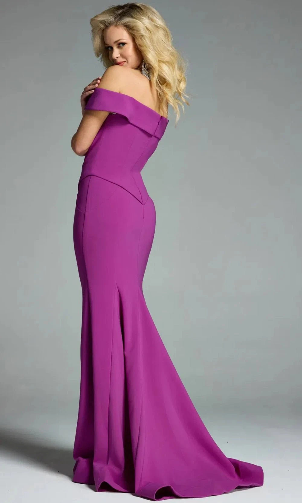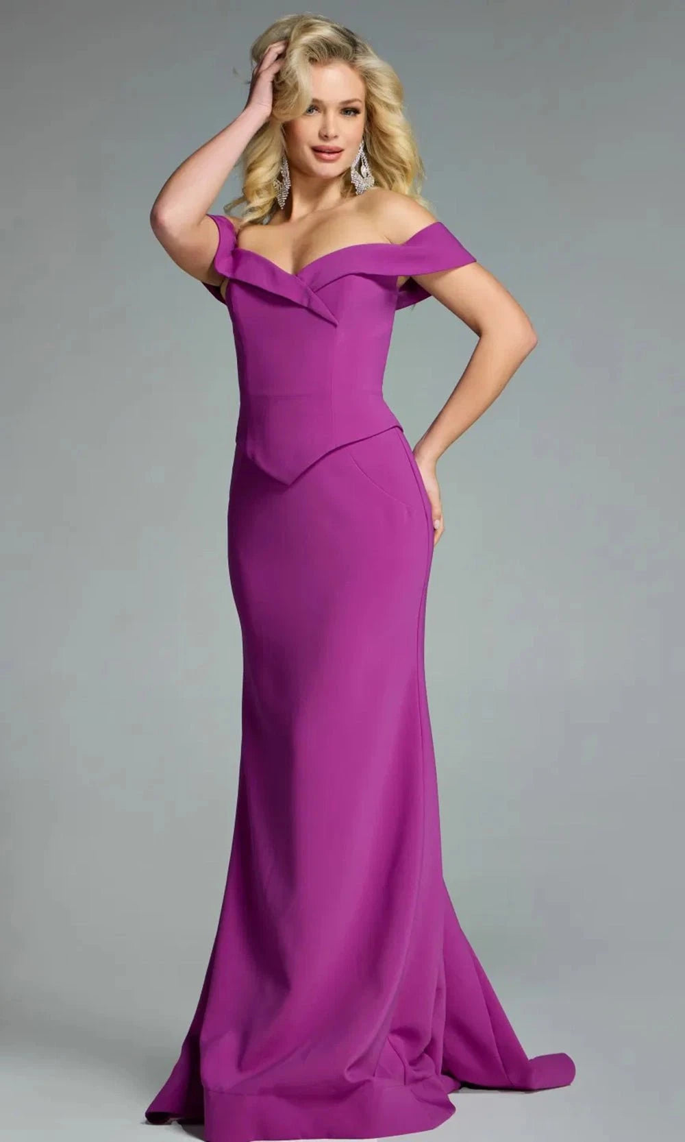 Chic sophistication defines the Jovani 44861, a striking formal gown designed for elegance and structure. This off shoulder silhouette features a sculptural fold-over neckline that adds dimension to the bodice. A structured sheath skirt provides a refined fit that highlights the body natural curves. Falling to a floor-length hem, it offers a minimal yet commanding presence. From upscale weddings to refined galas, the Jovani 44861 is a masterclass in sleek eveningwear. Model is wearing Light Purple color.