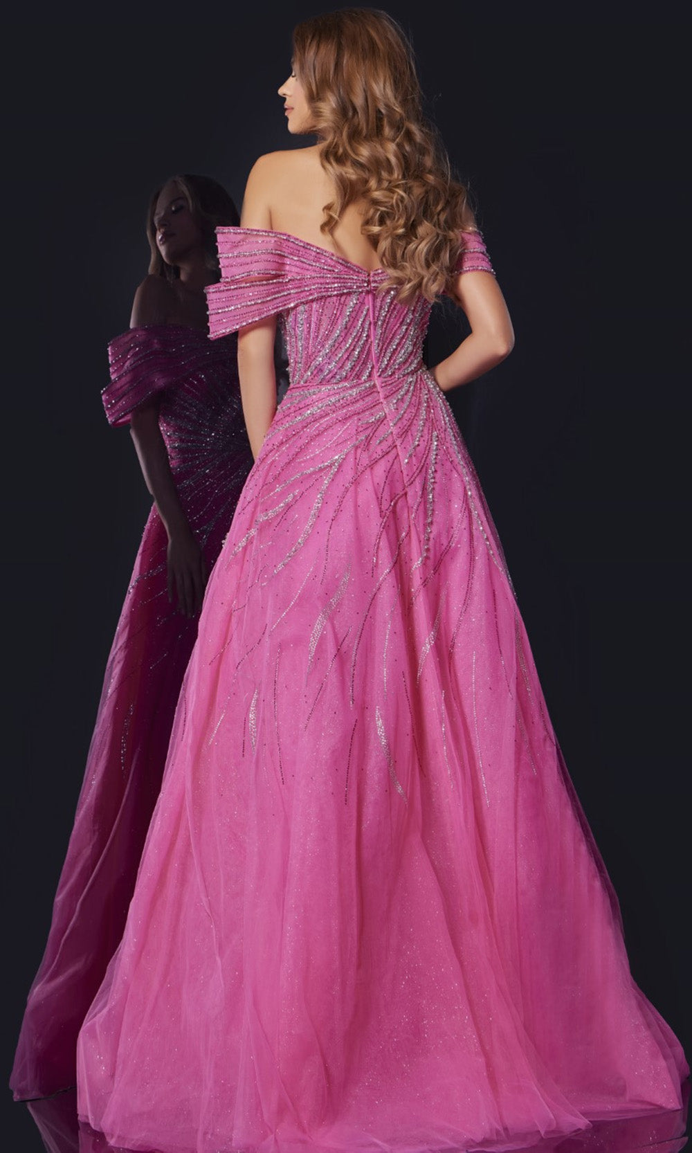 Leave onlookers spellbound with the graceful allure of this Jovani 45067 style. Beaded accents sweep gracefully across the bodice, leading into a full A-line skirt that exudes charm and depth. The off shoulder neckline adds structure without overpowering the flowing design. With each step, soft reflections glimmer under light, making the gown an exquisite choice for evening grandeur. Elevate your prom wardrobe with Jovani 45067, an embodiment of refined artistry and lasting appeal. Model is wearing Fuchsia color.