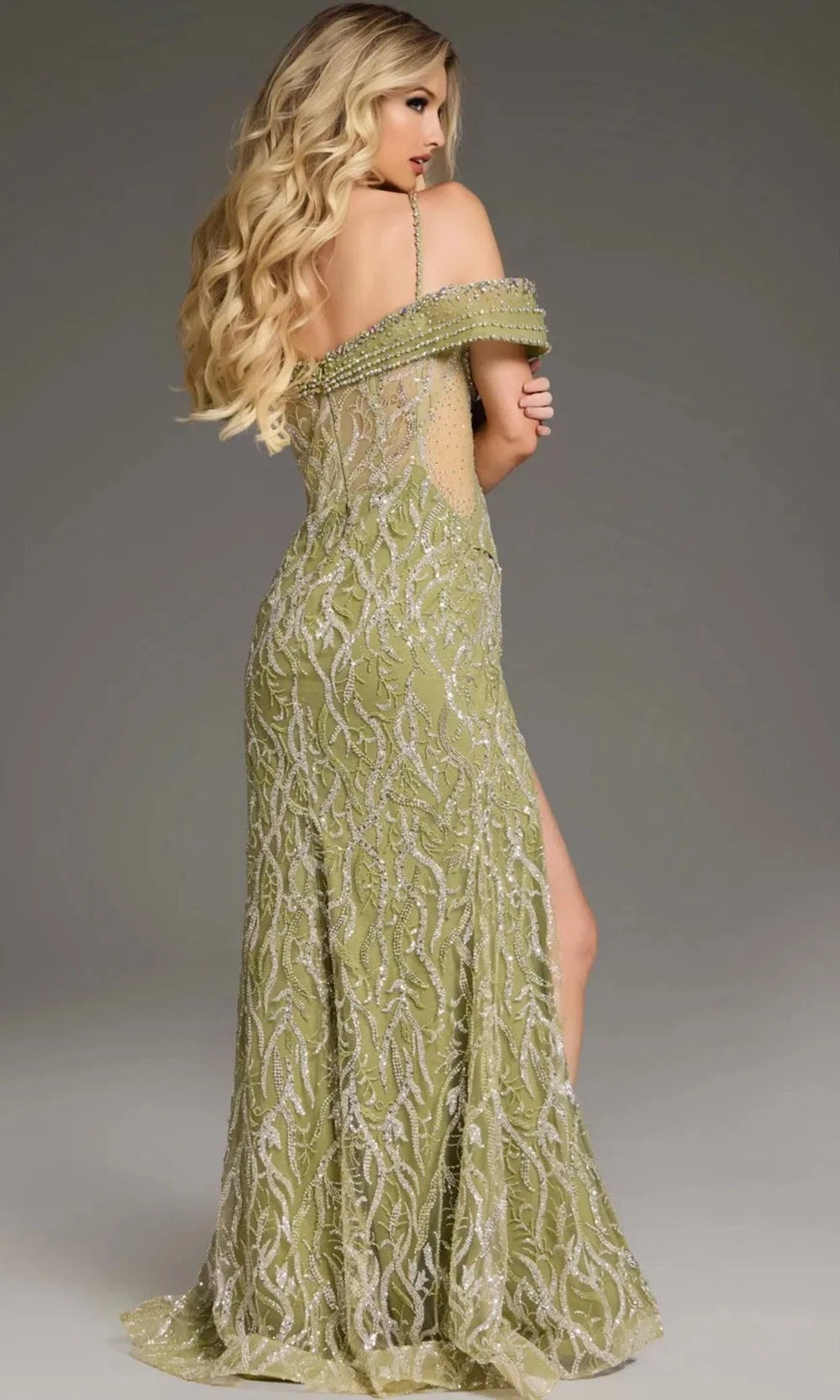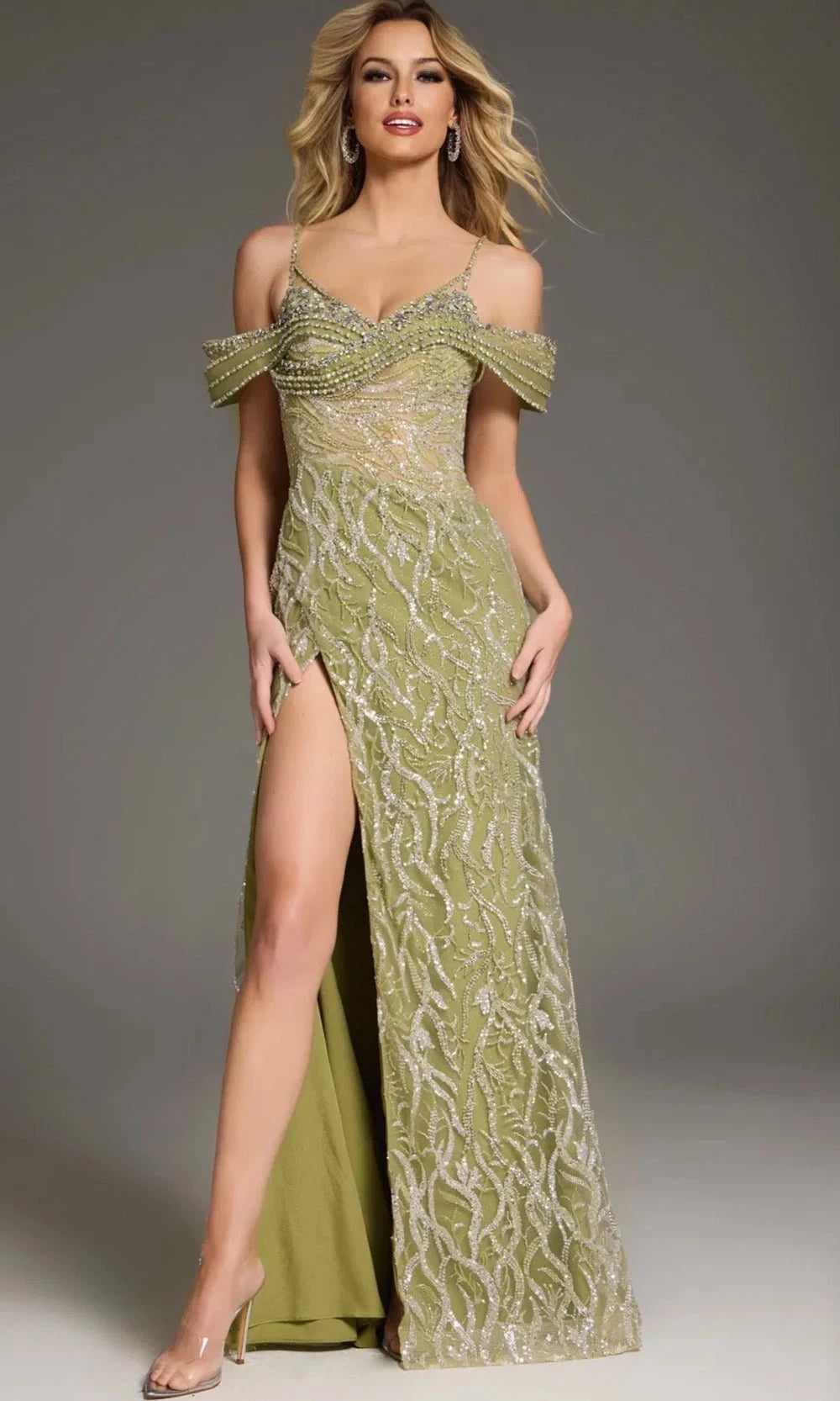 Elevate your look with the Jovani 45072, an intricately designed sheath gown that radiates timeless glamour. The illusion bodice is covered in detailed beadwork and shimmering sequins that catch and reflect the light with every movement. Draped off-shoulder sleeves and spaghetti straps add softness to the structured v-neckline, while the natural waistline creates a flattering silhouette. A daring thigh-high slit adds a contemporary flair, revealing just the right amount of leg. This Jovani 45072 long gown is perfect for high-profile galas, red carpet moments, or upscale celebrations. Model is wearing Sage color.