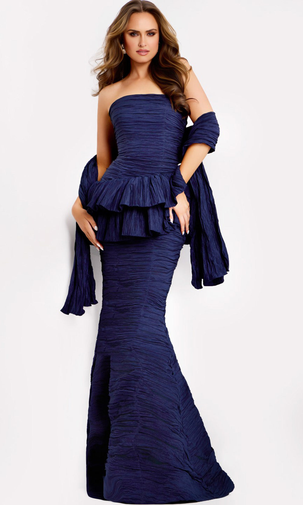 Sleek sophistication meets dramatic styling in the Jovani 45104, a gown that celebrates classic glamour. The ruched texture creates visual depth, wrapping the figure in flattering lines that emphasize natural curves. A layered peplum accentuates the waist, offering a touch of volume over the fitted mermaid skirt. The strapless straight across neckline frames the shoulders and collarbone beautifully, while the matching shawl provides a versatile styling option. The design flows into a sweep train for a graceful finish, making Jovani 45104 a refined choice for elegant evenings. Model is wearing Navy color.