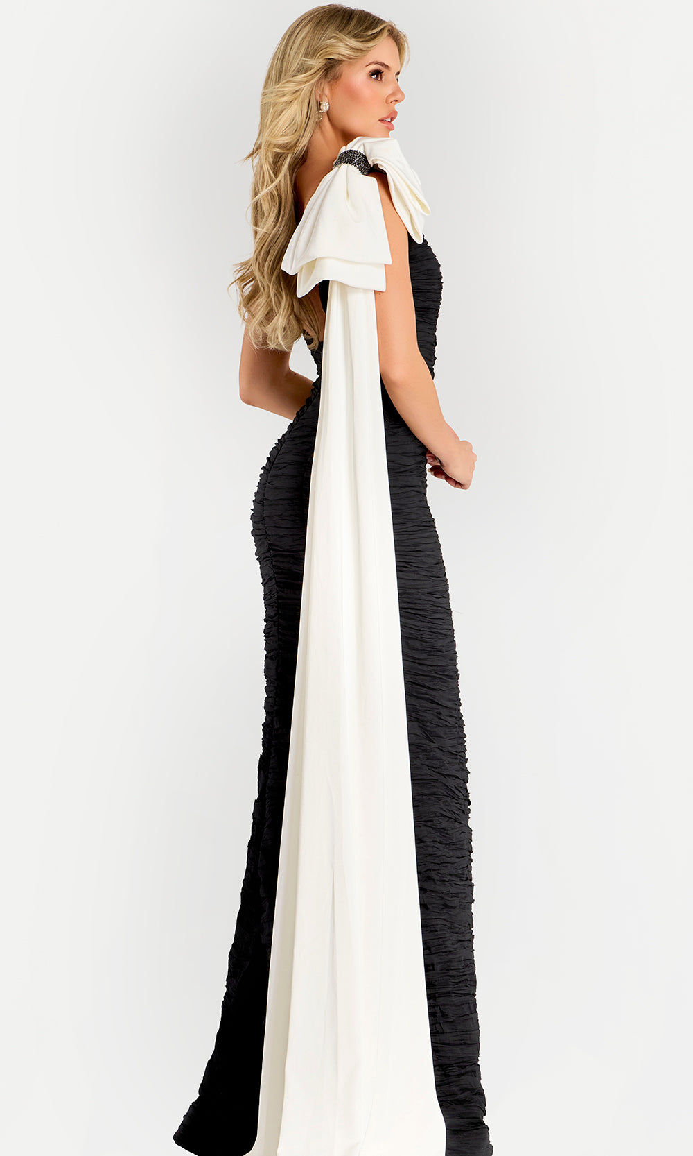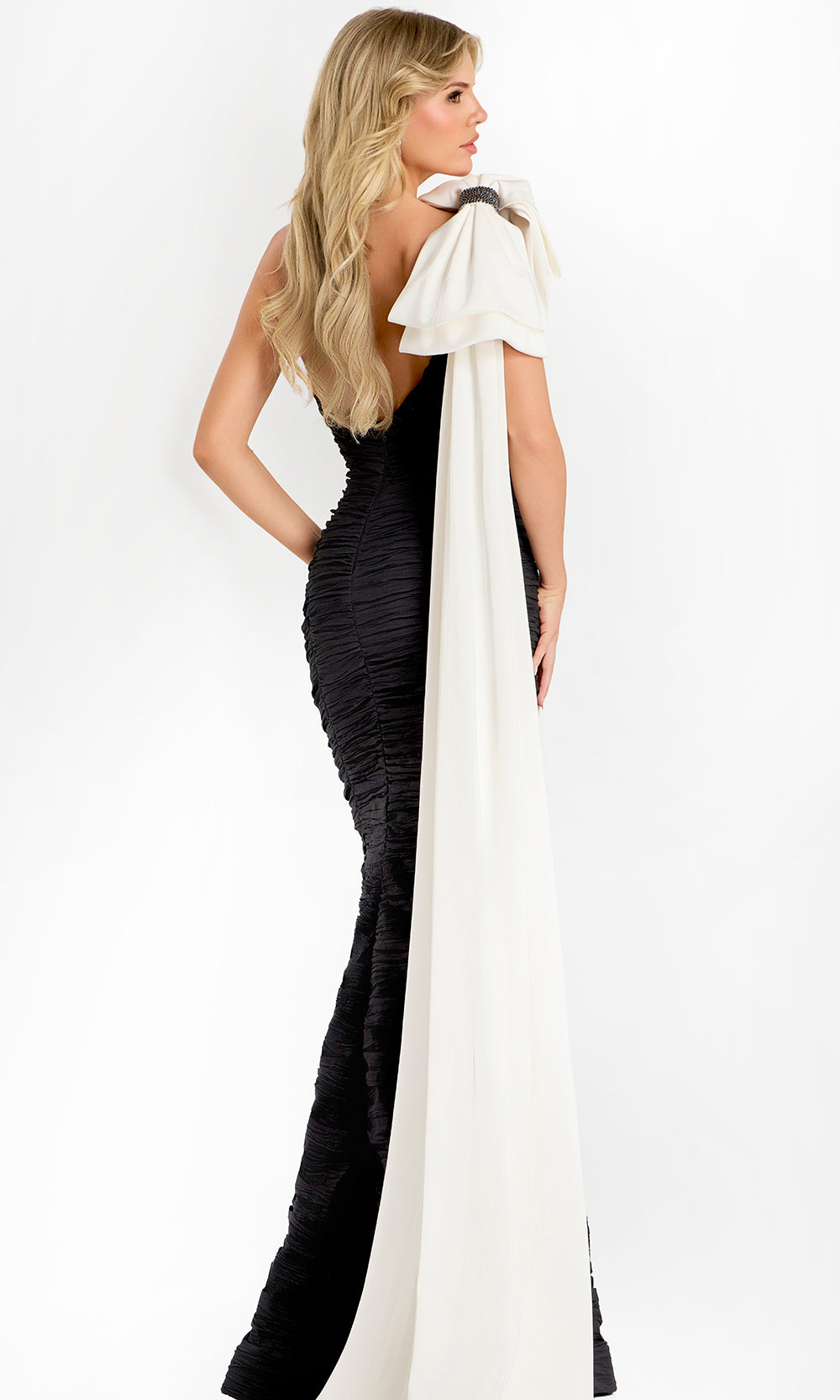 A head turning statement piece for refined events, Jovani 45176 embodies bold glamour and sculpted allure. The sweetheart neckline adds a flattering architectural element that supports the dramatic oversized shoulder bow, which extends into a sweeping train for theatrical movement. Ruched detailing along the bodice enhances the silhouette elegance while guiding attention to the fitted waist before cascading into a classic mermaid skirt. Perfect for red carpet moments and grand celebrations, Jovani 45176 delivers standout presence with undeniable impact. Model is wearing Black/White color.
