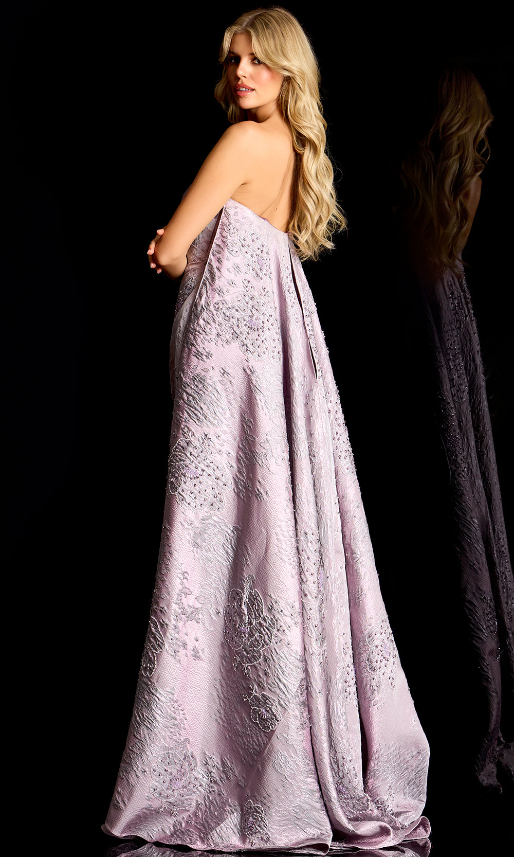 Jovani 45309 offers unmatched allure in evening wear with its striking silhouette and draped design that evokes red-carpet elegance. The gown opens with a strapless straight-across neckline that accentuates the shoulders, balanced by a fitted bodice that creates a flattering frame. A dramatic Watteau train cascade adds volume and movement to the silhouette, while rich textured floral pattern and beading elevates the look with depth. Perfect for black tie galas or premier celebrations, Jovani 45309 column gown invites you to make a commanding entrance. Model is wearing Mauve color.