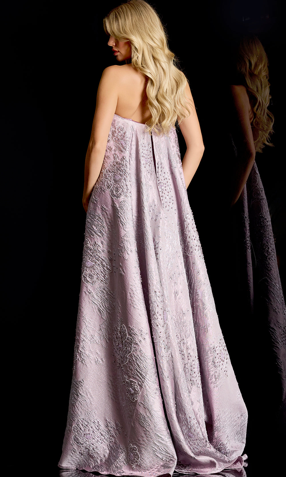 | Details: | Strapless, Textured Floral Pattern, Dramatic Watteau Train, Beaded Accent |