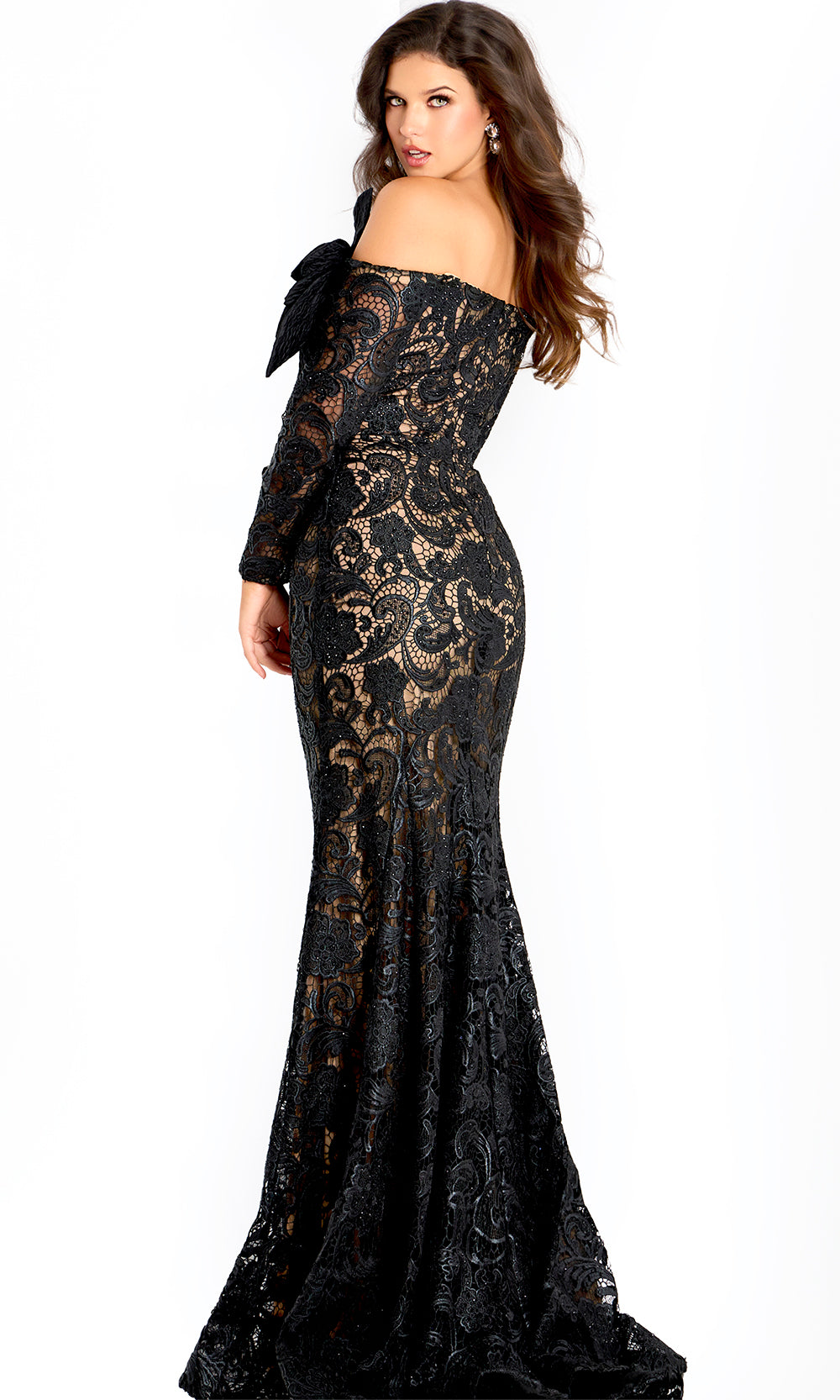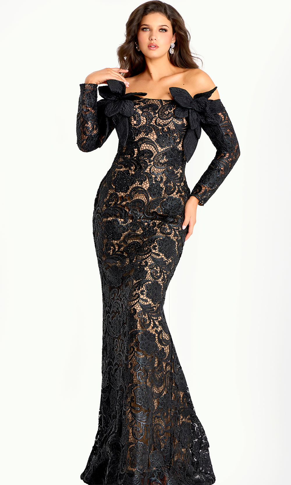 Make a sophisticated statement with Jovani 45345, a lace gown that harmonizes refined design with bold femininity. Its off shoulder neckline presents a graceful line across the shoulders, while long lace sleeves lend classic allure. The silhouette transitions into a long mermaid skirt that emphasizes curves and adds drama to your walk. A distinctive bow accent provides a touch of elevated feminine detailing. Ideal for galas or black tie weddings, Jovani 45345 style promises memorable elegance. Model is wearing Black color.