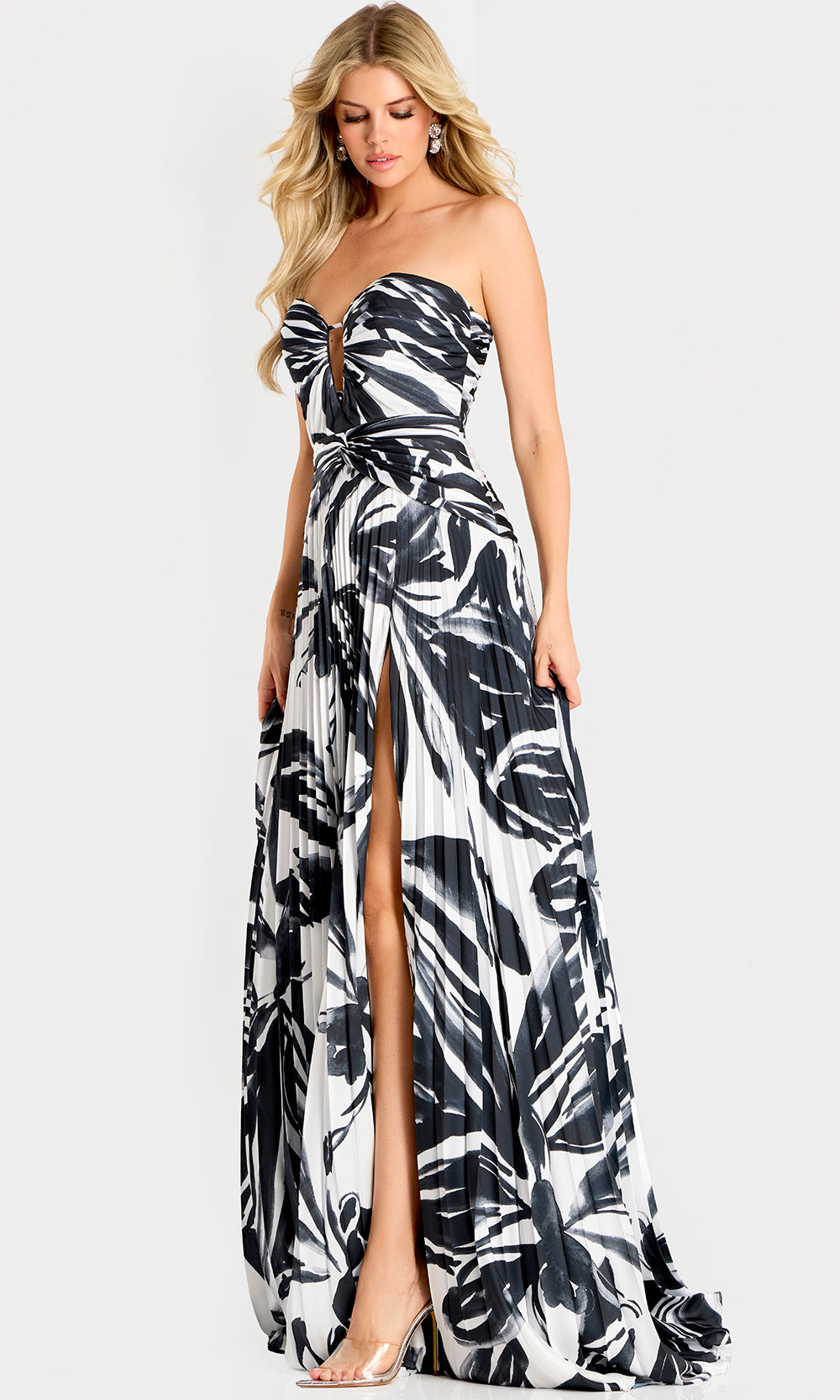 Confidence meets movement in the Jovani 45366 style, a captivating printed gown that captures contemporary sophistication. The sweetheart with keyhole cutout draws focus to the collarbone, balanced beautifully by the pleated bodice that defines the waist. A daring keyhole front adds a hint of allure, while the A-line skirt cascades fluidly with a high slit for graceful drama. Ideal for formal galas, luxury vacations, or evening receptions, Jovani 45366 embodies effortless glamour with modern artistry and striking silhouette. Model is wearing Black/White color.