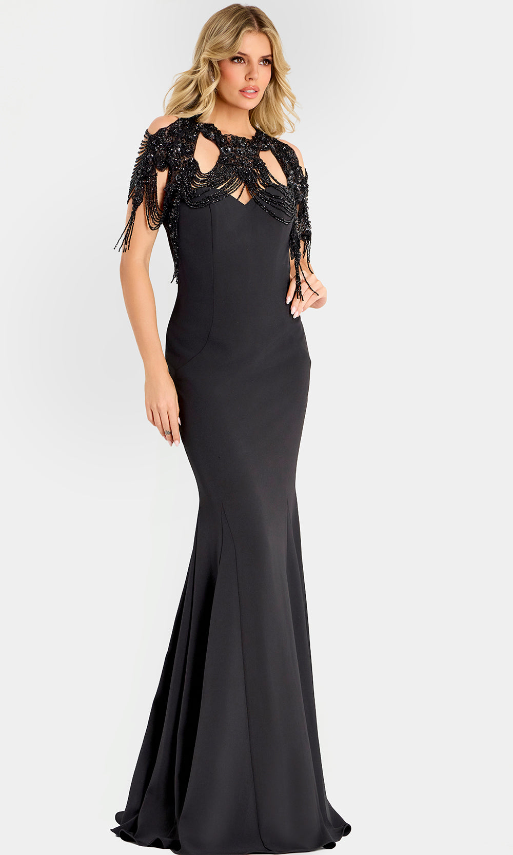 Jovani 45442 showcases impeccable artistry, merging contemporary structure with dazzling embellishment for those who seek sophisticated glamour. The sweetheart neckline emphasizes the collarbone, leading into a remarkable beaded cape that drapes elegantly around the shoulders. Each intricate bead captures light with fluid motion, adding visual texture and refined allure. The mermaid silhouette sculpts the figure, gently flaring toward the hem. Perfect for black-tie affairs, Jovani 45442 ensures an unforgettable impression defined by grace, confidence, and elevated luxury. Model is wearing Black color.