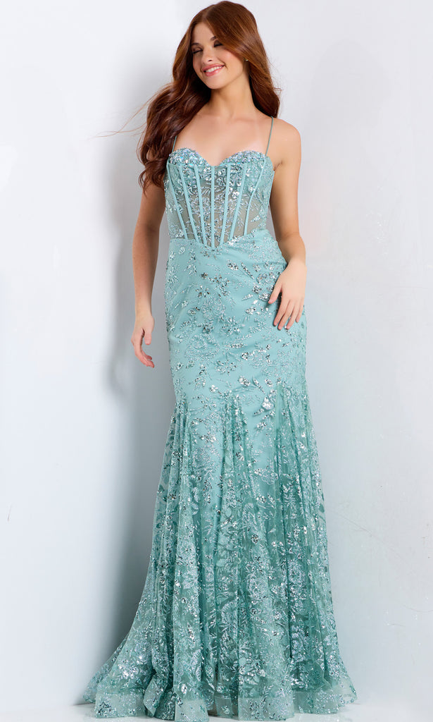 Inspired by timeless artistry, this Jovani 45759 dress exudes elegance with exquisite beading that shimmers delicately. The illusion corset bodice defines the Basque waist, giving structure and form while maintaining softness in its look. Spaghetti straps accentuate the sweetheart neckline, flowing into a trumpet skirt that flares beautifully at the hem. Enchant your audience with Jovani 45759, a sleeveless style that transforms any special occasion into a moment of luxury. Model is wearing Sage color.