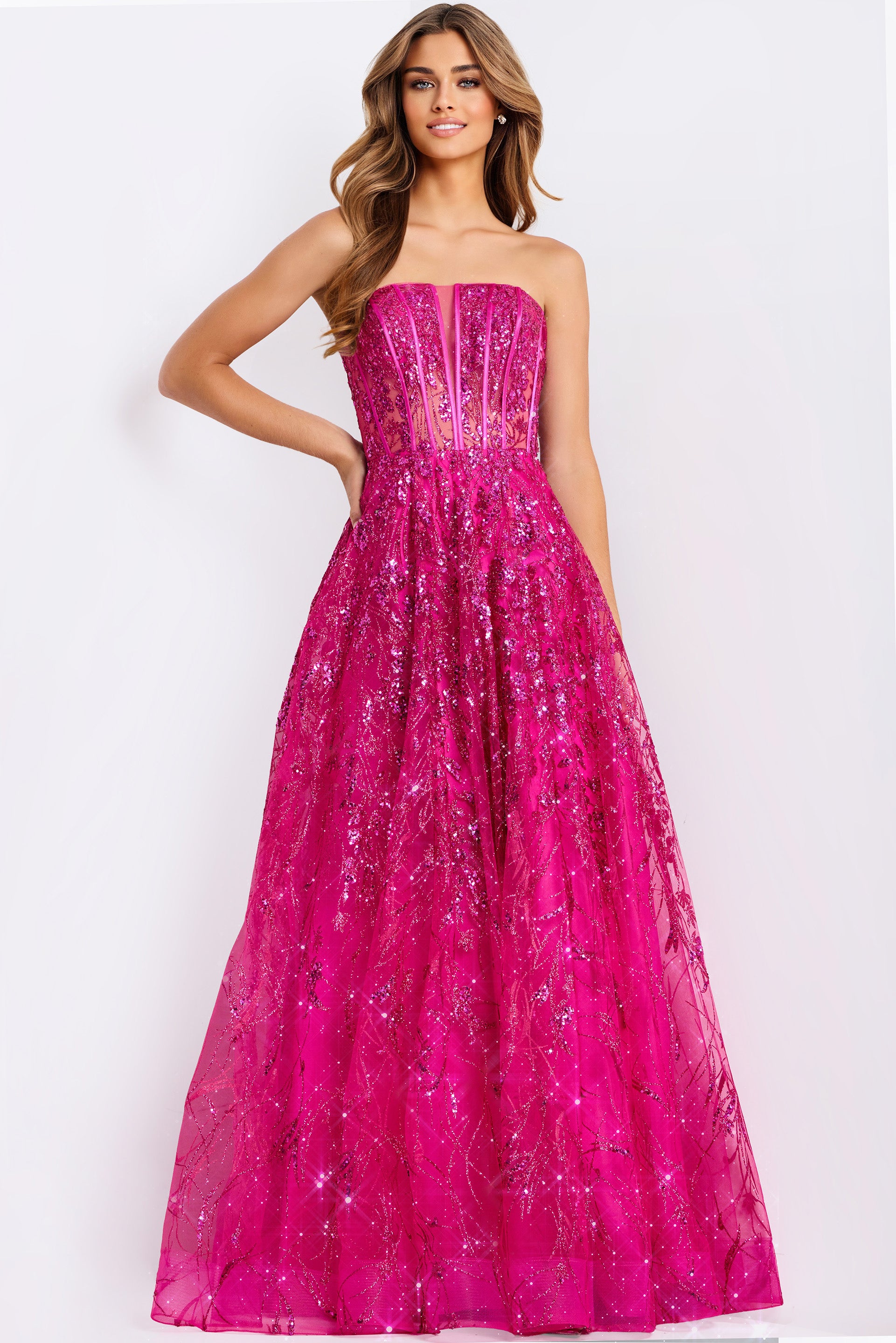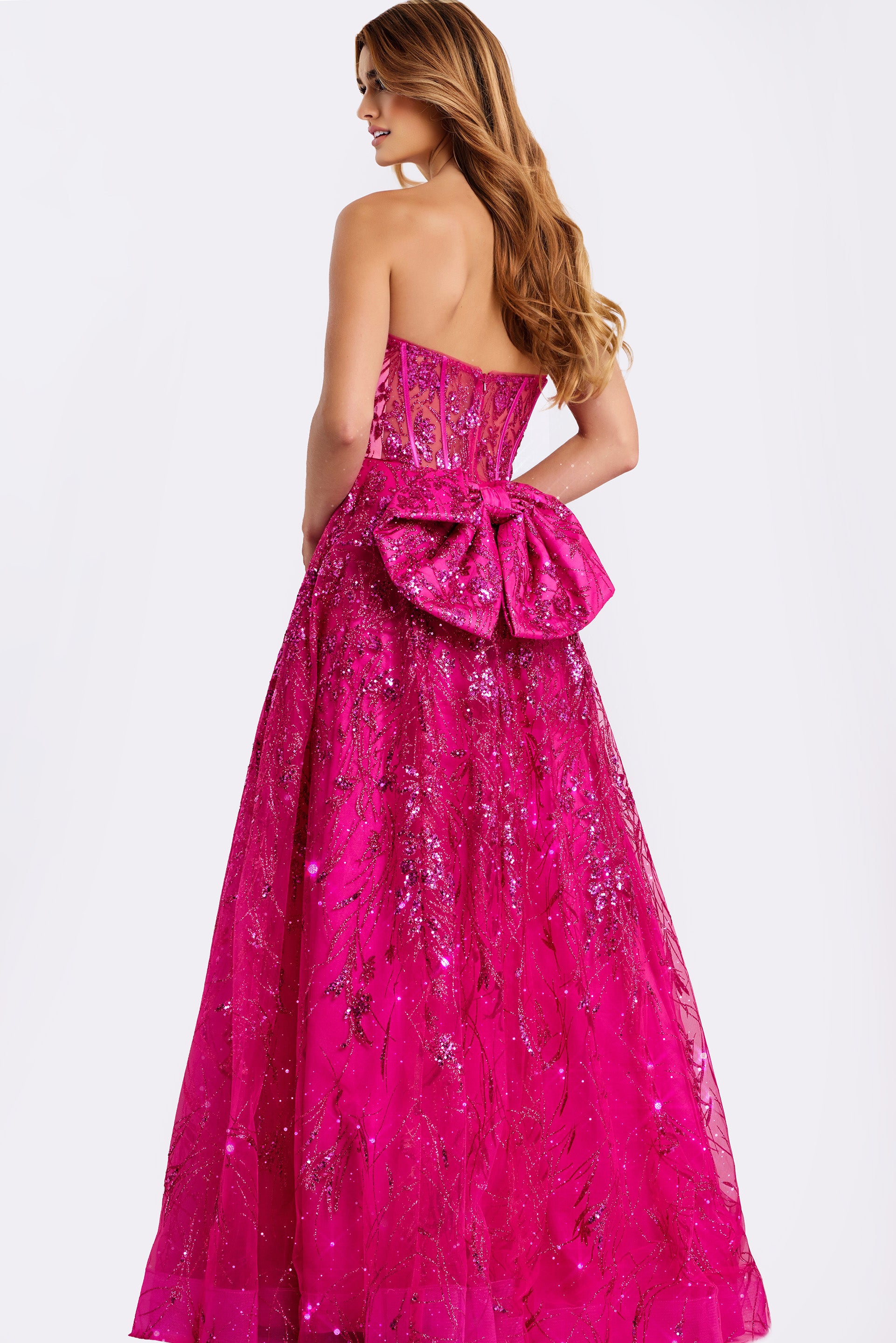 Radiant detailing and classic structure define the presence of Jovani 45913, beginning with a strapless straight-across neckline that highlights the upper silhouette. From the waist, a full A-line skirt extends outward, creating dramatic volume and fluid movement. Shimmer embellishments are distributed throughout to add dimension without overpowering the design. An oversized bow detail highlights the back, complemented by a discreet zipper closure. The combination of structure and sparkle makes Jovani 45913 a standout option for prom and special evenings. Model is wearing Rasberry color.