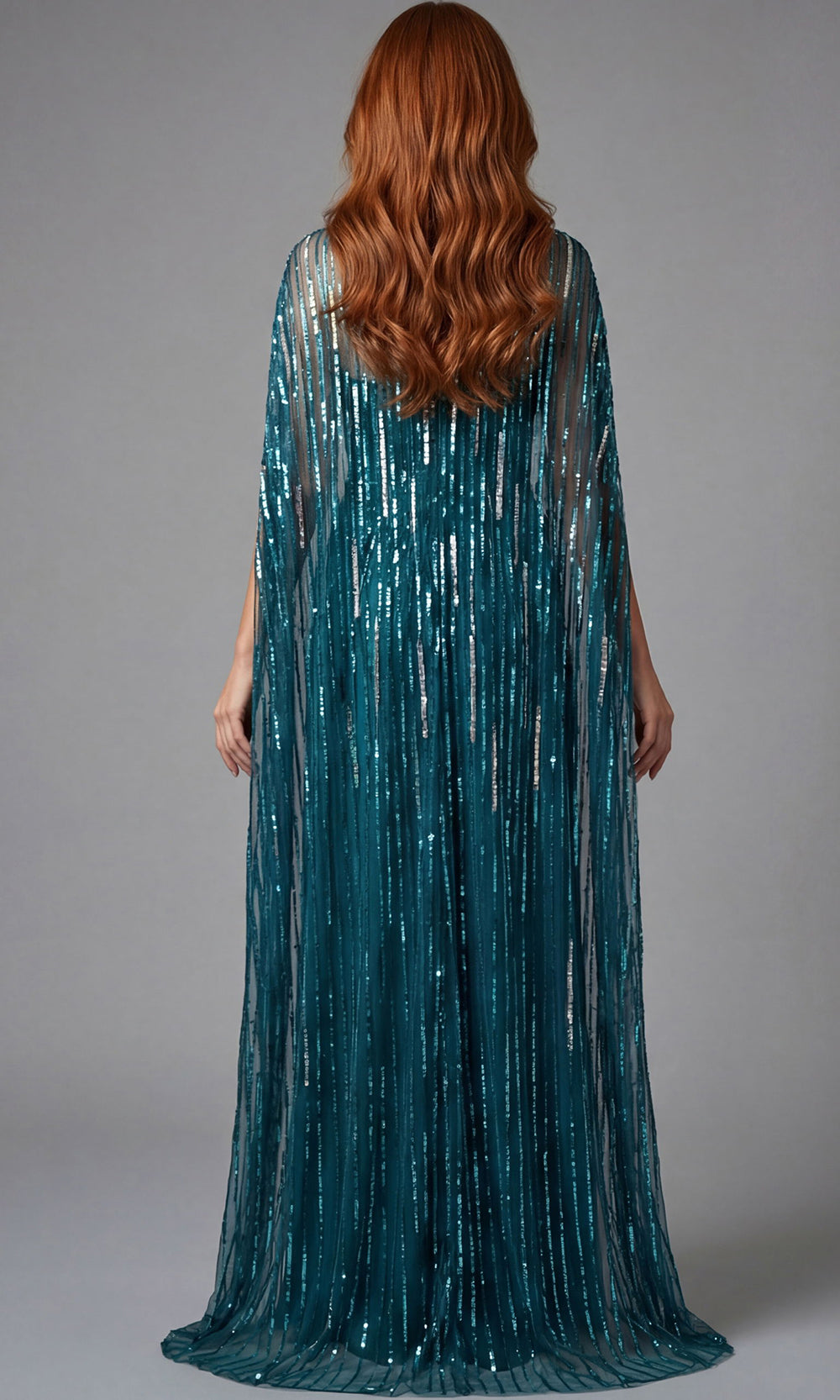 | Details: | Vertical Sequin Detailing, Flowing Cape Overlay, Floor Length Hem |