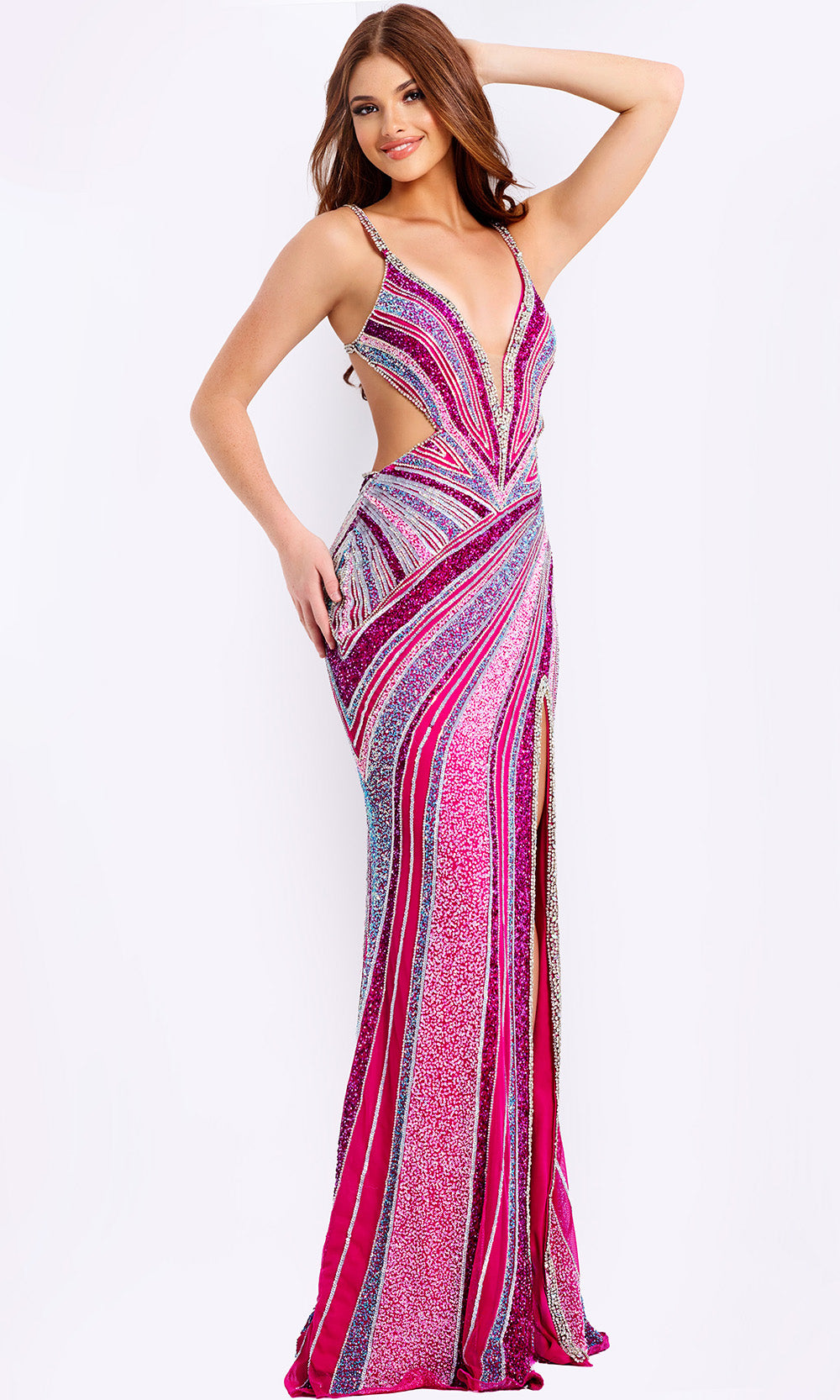 Bold radiance takes center stage in the Jovani 46206 as its sculptural beaded pattern creates a dynamic look meant for unforgettable entrances. The plunging v-neckline introduces modern appeal, while side cutouts highlight the fitted silhouette with confident precision. A high slit brings movement and elongation, balancing the geometric striped beading embellishment that shapes the gown from every angle. Set the tone for a striking evening appearance and elevate any special celebration with the Jovani 46206 sheath gown. Models are wearing Green, and Pink colors.