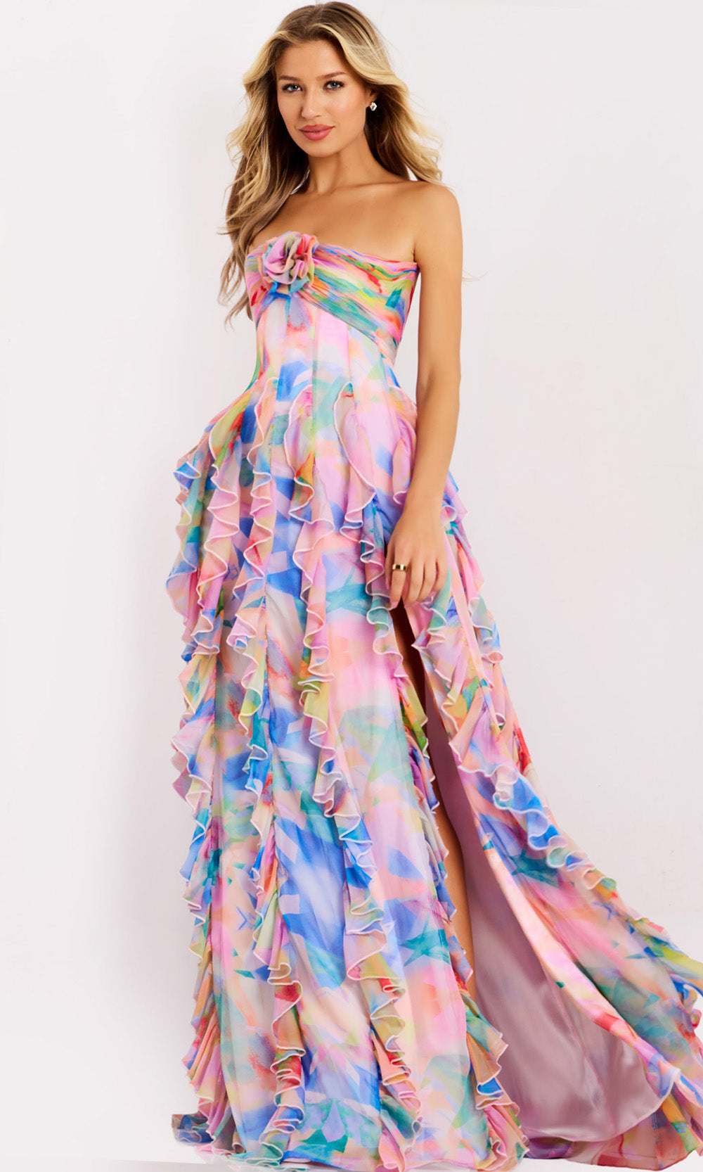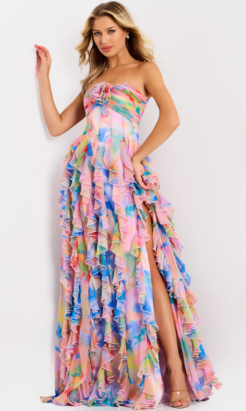 Playful motion defines this Jovani 46381 gown, where layers unfold with a soft cascading effect. The ruffled A-line skirt adds volume and movement, while the strapless straight-across neckline highlights the shoulders beautifully. A front slit provides subtle allure, balancing the whimsy of the silhouette with modern refinement. The vibrant print enhances its charm, giving it a lively visual rhythm. Jovani 46381 celebrates texture and flow through its layered artistry, creating a gown that feels both dynamic and unforgettable. Model is wearing Print color.