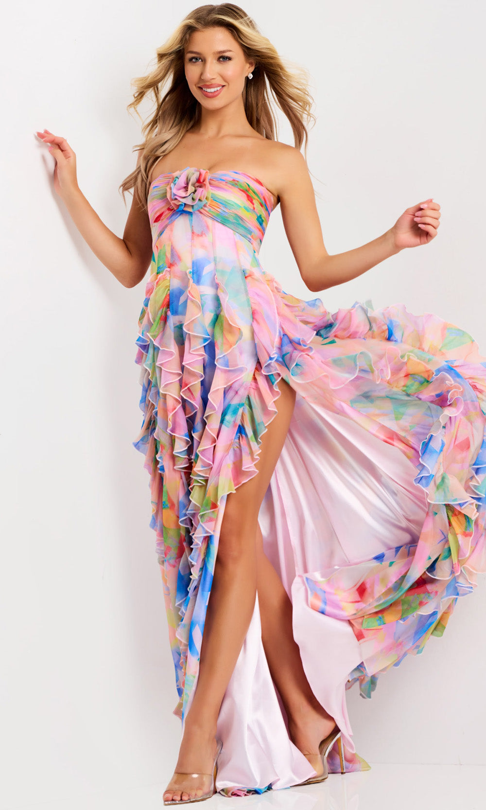 | Details: | Strapless, Ruffled Layers, High Slit, Multicolor Floral Print, Back Zipper Closure |