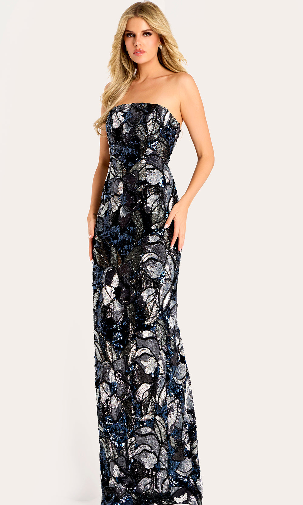 Step into radiance with Jovani 46431, a breathtaking gown that embodies grace and artistry through its shimmering floral sequin embellishments. The strapless straight-across neckline defines the shoulders with refined simplicity, while the fitted bodice contours the waist for a flattering shape. Flowing from the natural waistline, the full column skirt moves with captivating ease, creating balance and grandeur. The cape overlay frames the arms with added coverage, contributing to a polished overall look. Designed to impress at upscale galas or formal receptions, Jovani 46431 is the epitome of poised evening glamour. Model is wearing Navy/Silver color.