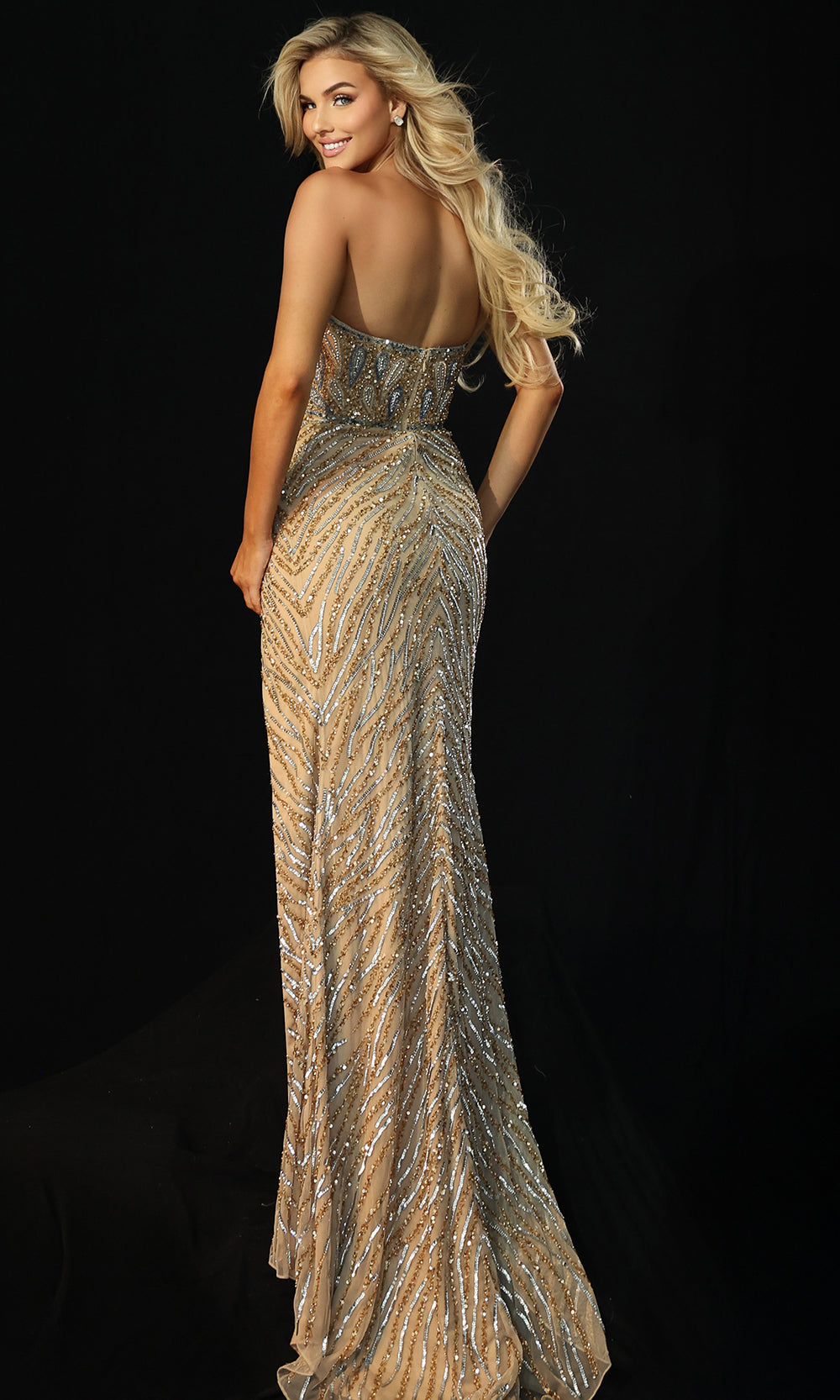 | Details: | Intricate Beaded Pattern, Side Slit, Strapless, Open Back, Sweep Train, Form-Fitting Design |