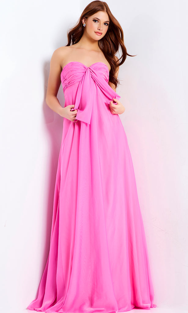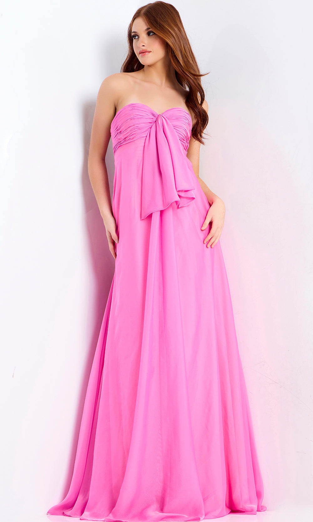 A romantic atmosphere surrounds Jovani 47041, offering a flowing look made for memorable celebrations. The strapless sweetheart neckline frames the upper silhouette beautifully, while gentle ruching across the bodice adds visual interest. A softly draped front bow provide an extra bit of romance. The A-line skirt falls effortlessly to the floor, giving the design a light and airy presence. Perfect for formal evenings or prom events, Jovani 47041 gown invites timeless appeal. Model is wearing Hot-Pink color.