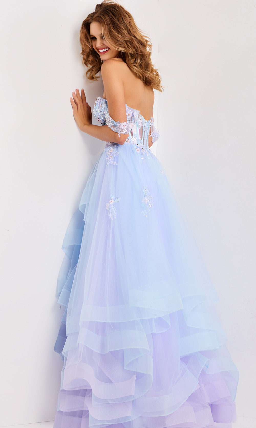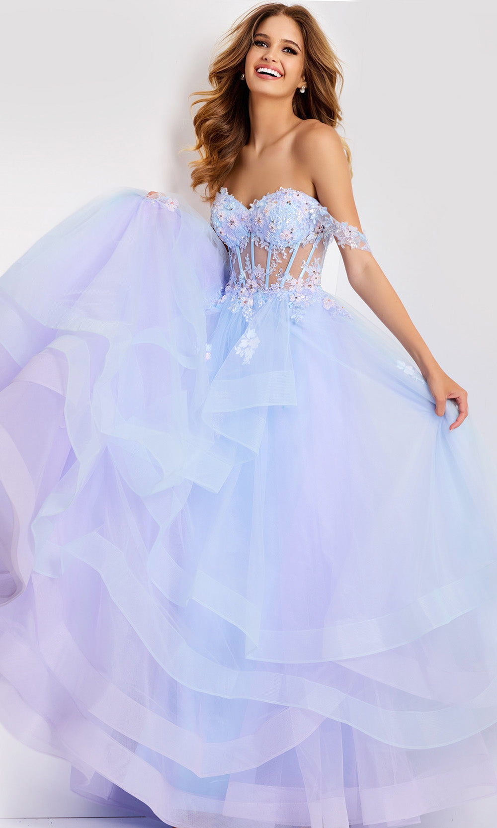 Whispers of romance come alive through this Jovani 47427 layered gown made for grand entrances. The off-shoulder sleeves highlight the sweetheart neckline, while floral appliques adorn the bodice in intricate detail. Tulle layers cascade into a full ballgown skirt, creating movement and lightness that captivate under soft light. Every element works together to form a structure of beauty and poise. Make a statement of sophistication and grace by choosing Jovani 47427, a gown that defines unforgettable evenings. Model is wearing Lilac color.
