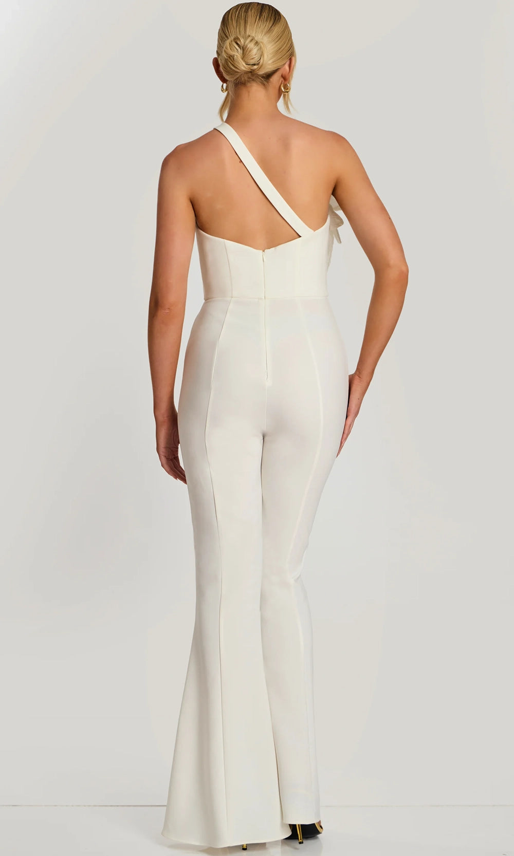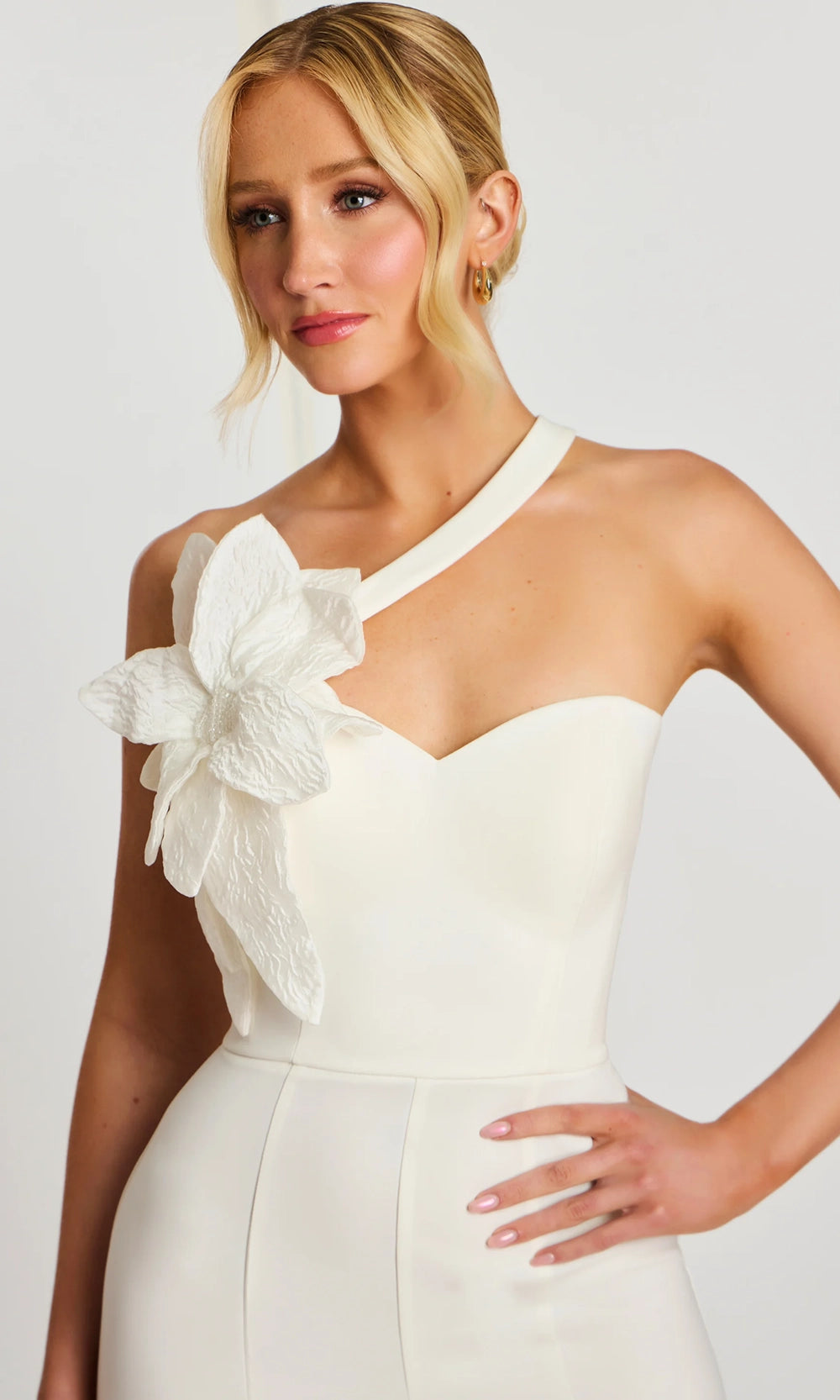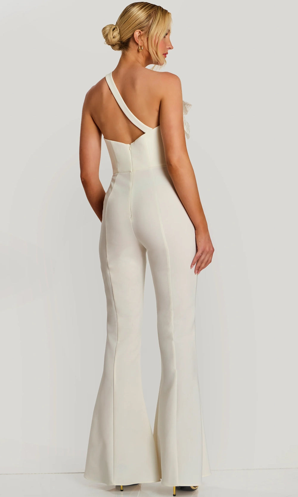 Sculptural drama leads the way in Jovani 47545, a jumpsuit that brings evening glamour into a fashion forward silhouette. The one shoulder neckline is paired with a statement floral accent that adds dimension at the upper frame. A sweetheart bodice and shaped waist create a flattering fit before the design falls into flared pants that lengthen the figure beautifully. Front slits add motion and a daring finish to the look. Jovani 47545 is a standout choice for receptions, parties, and dressy celebrations. Model is wearing Off-White color.