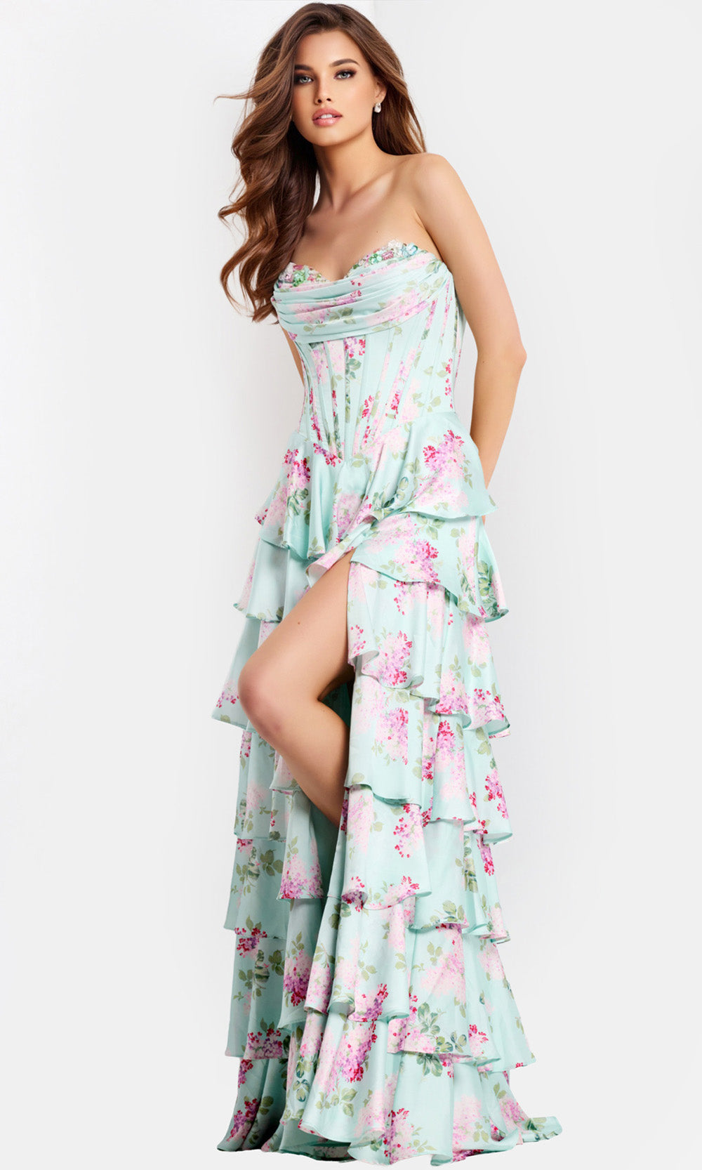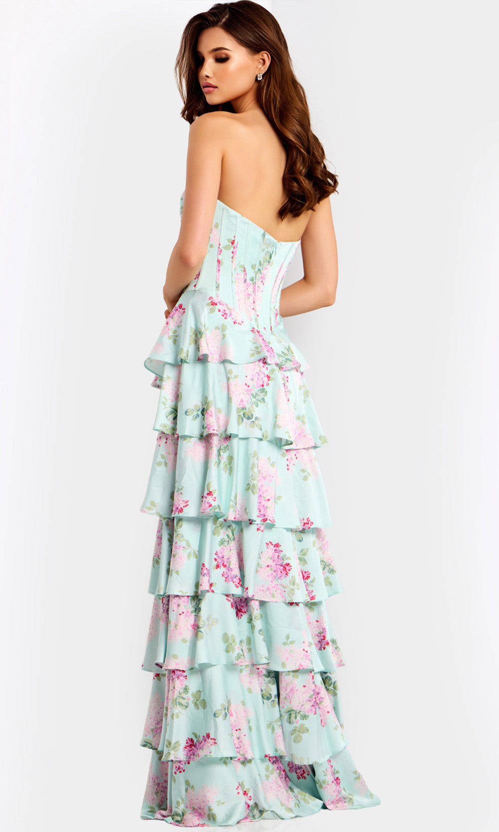 A celebration of elegance and motion, this Jovani 47579 gown exudes with layered dimension and thoughtful craftsmanship. The strapless corset bodice hugs the form before cascading into tiered ruffle A-line skirt that sway beautifully as you move. A slit introduces a subtle hint of allure, giving balance to the gown voluminous design. Floral print spread across the layers, adding vibrancy and charm to the look. Let your evening glow in Jovani 47579, a gown that brings artistry and sophistication together in seamless harmony. Model is wearing Print color.
