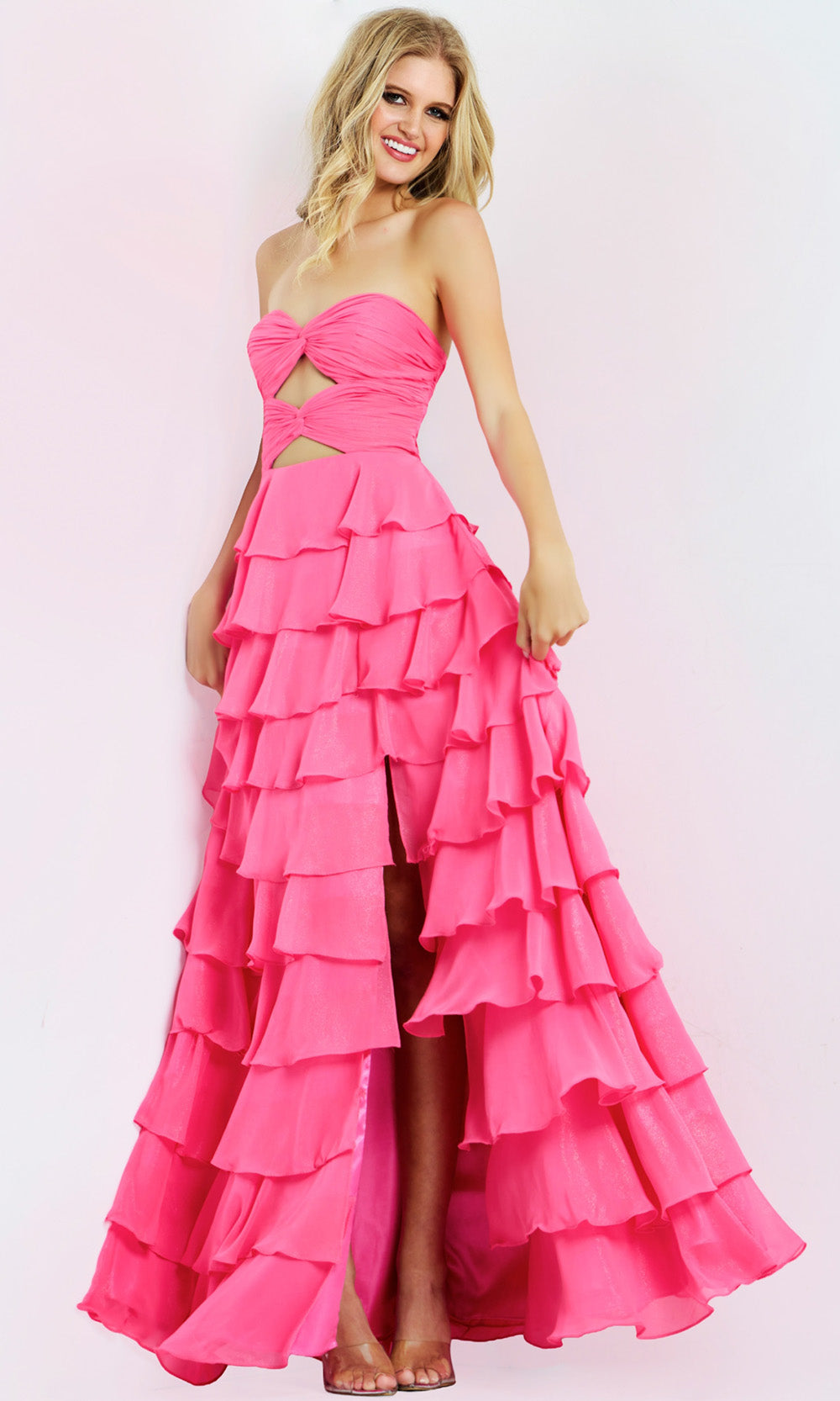 This Jovani 47898 creation expresses charm through motion, blending layers of softness and sophistication. The strapless bodice and sweetheart neckline frames the upper figure, while a tasteful cutout and ruched twist front introduces an artistic touch. A cascade of tiered ruffles descends through the A-line skirt, giving the dress its light and airy rhythm. The side slit complements the design, adding ease to the flow. Jovani 47898 is created for moments that call for energy, confidence, and refined beauty. Model is wearing Pink color.