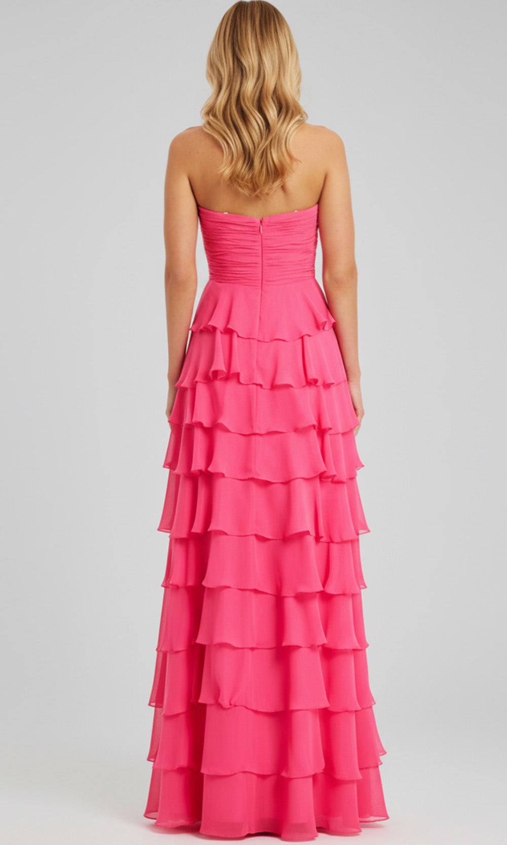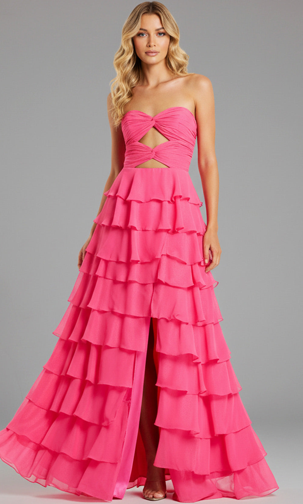 | Details: | Strapless, Keyhole Cutouts, Tiered Ruffle Skirt, Slit, Mid-Open Back, Ruched Twist-Front Bodice |