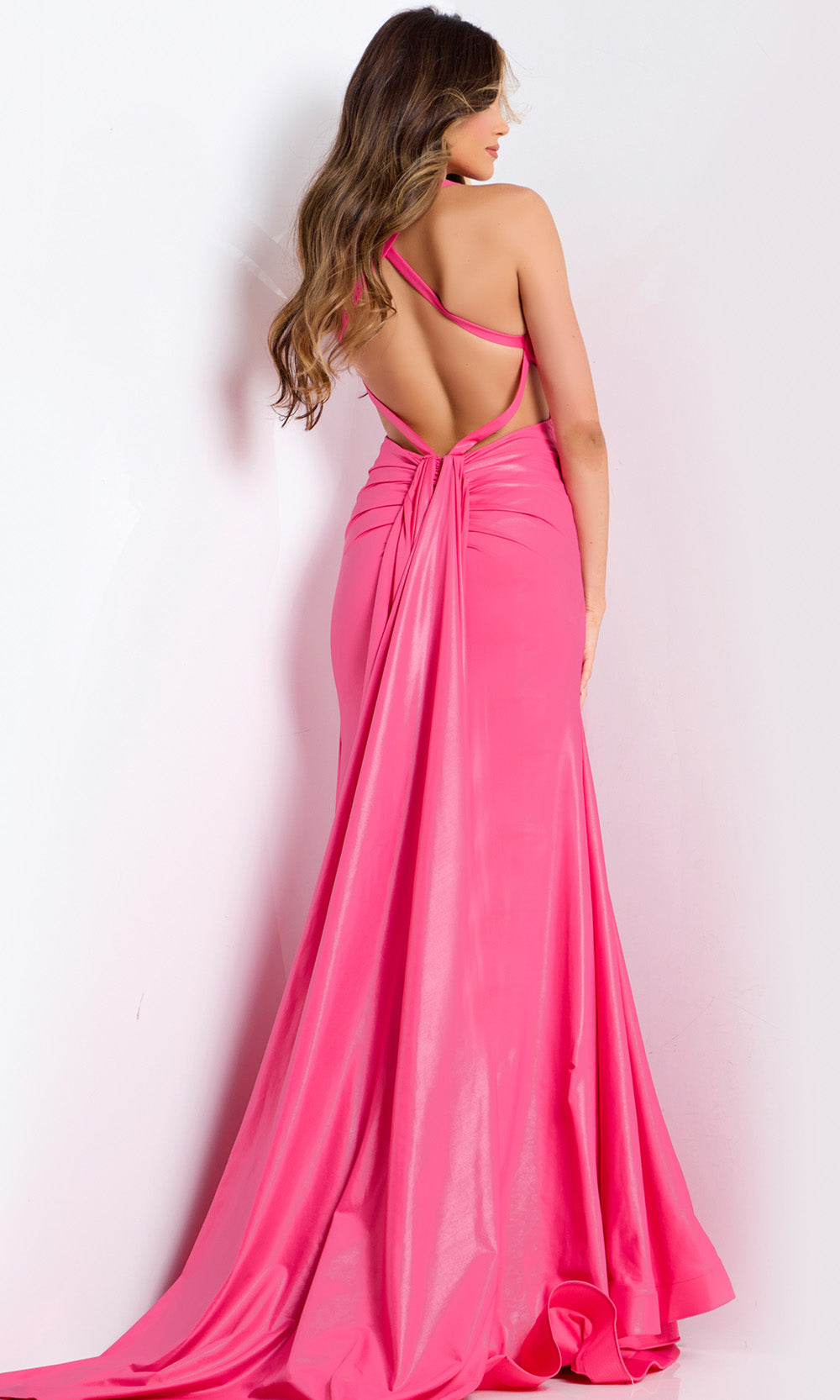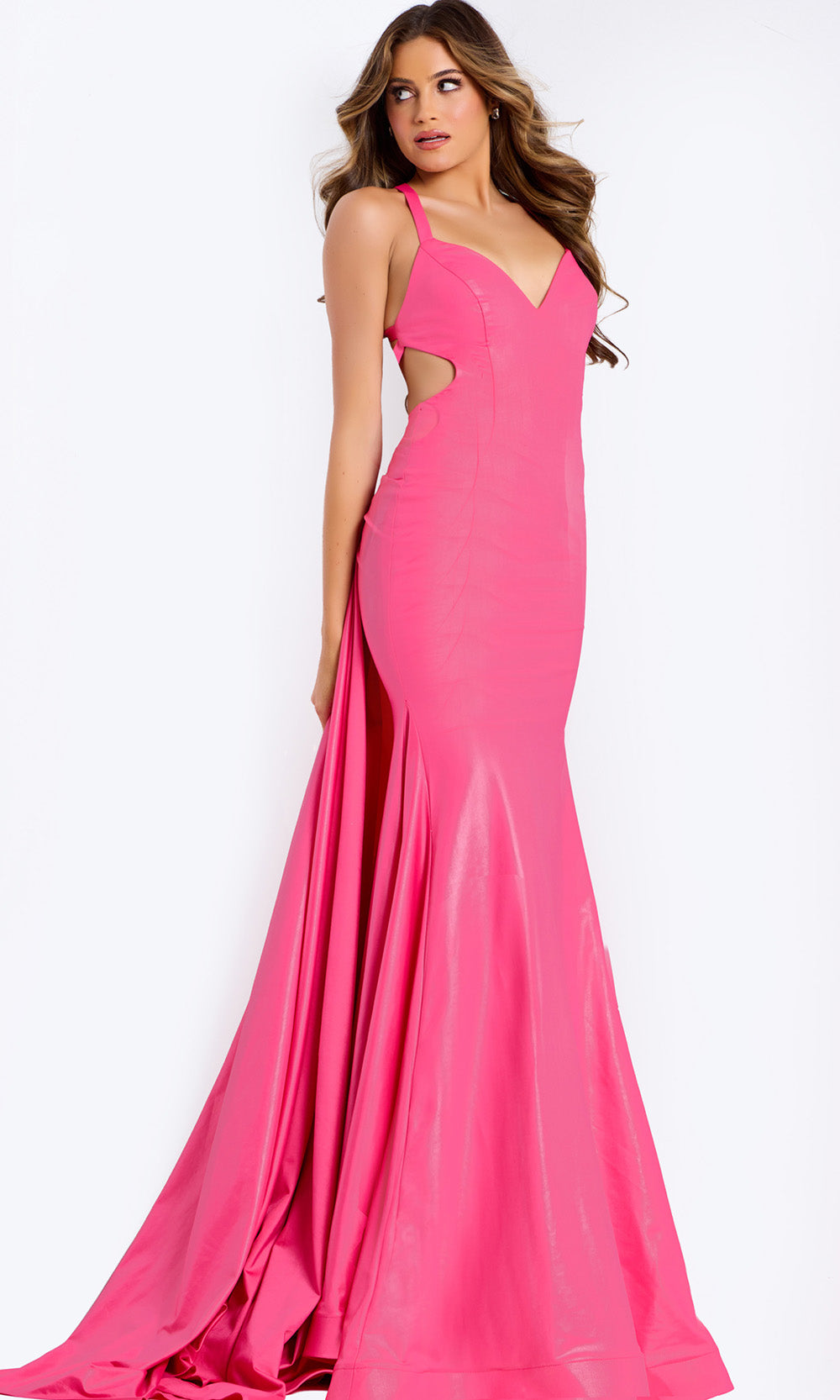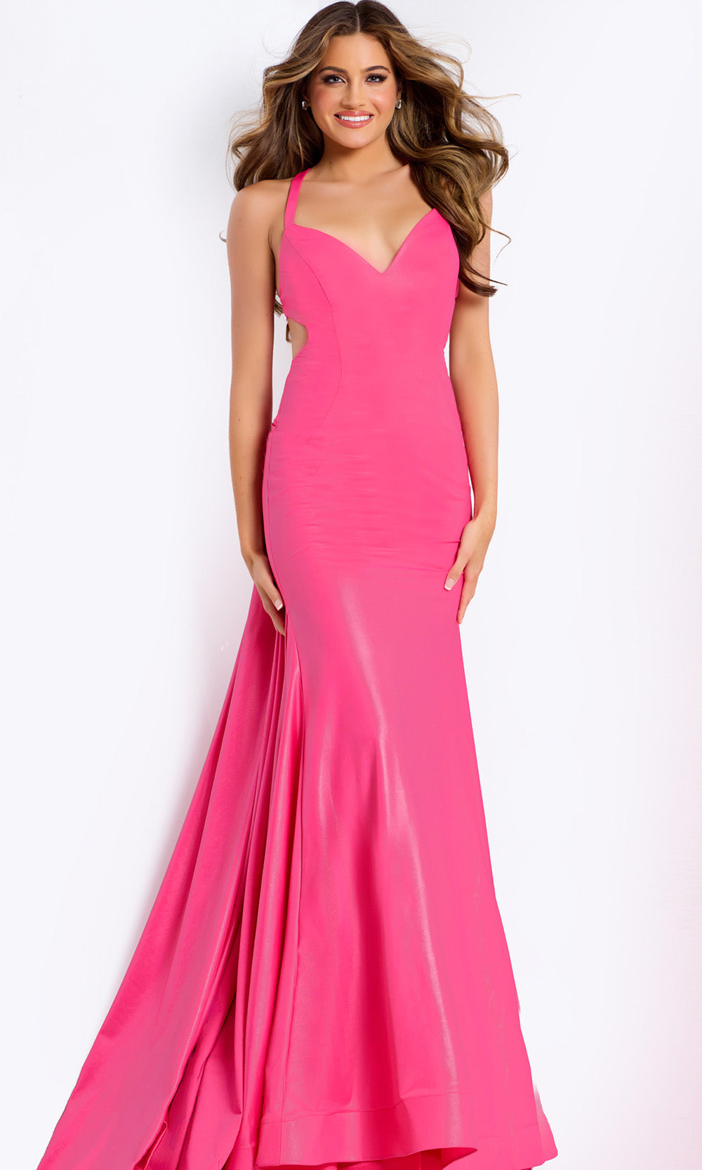 A captivating aura surrounds the Jovani 48291 sleeveless gown, exuding confidence through its sleek form and graceful presence. The satin fabric sculpts a stunning sheath silhouette that flatters the figure from every angle. Thoughtfully placed side cutouts and an open strappy back with soft draping strike an elegant balance between modern edge and refined beauty. Its sheath skirt moves beautifully with each step, creating a seamless flow. Jovani 48291 offers an unforgettable expression of contemporary glamour and charm for any special occasion. Models are wearing Black, Fuchsia, Mint, and Red colors.