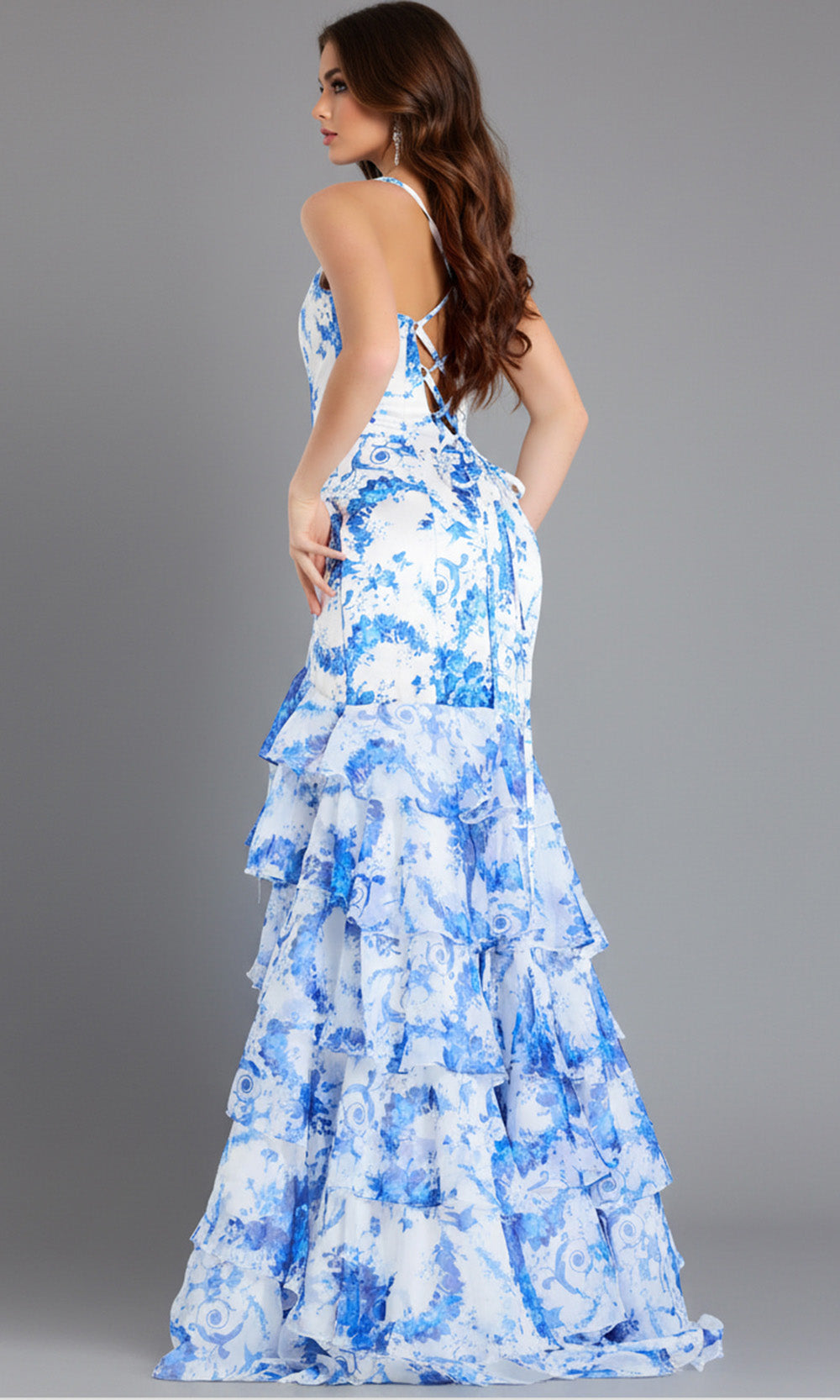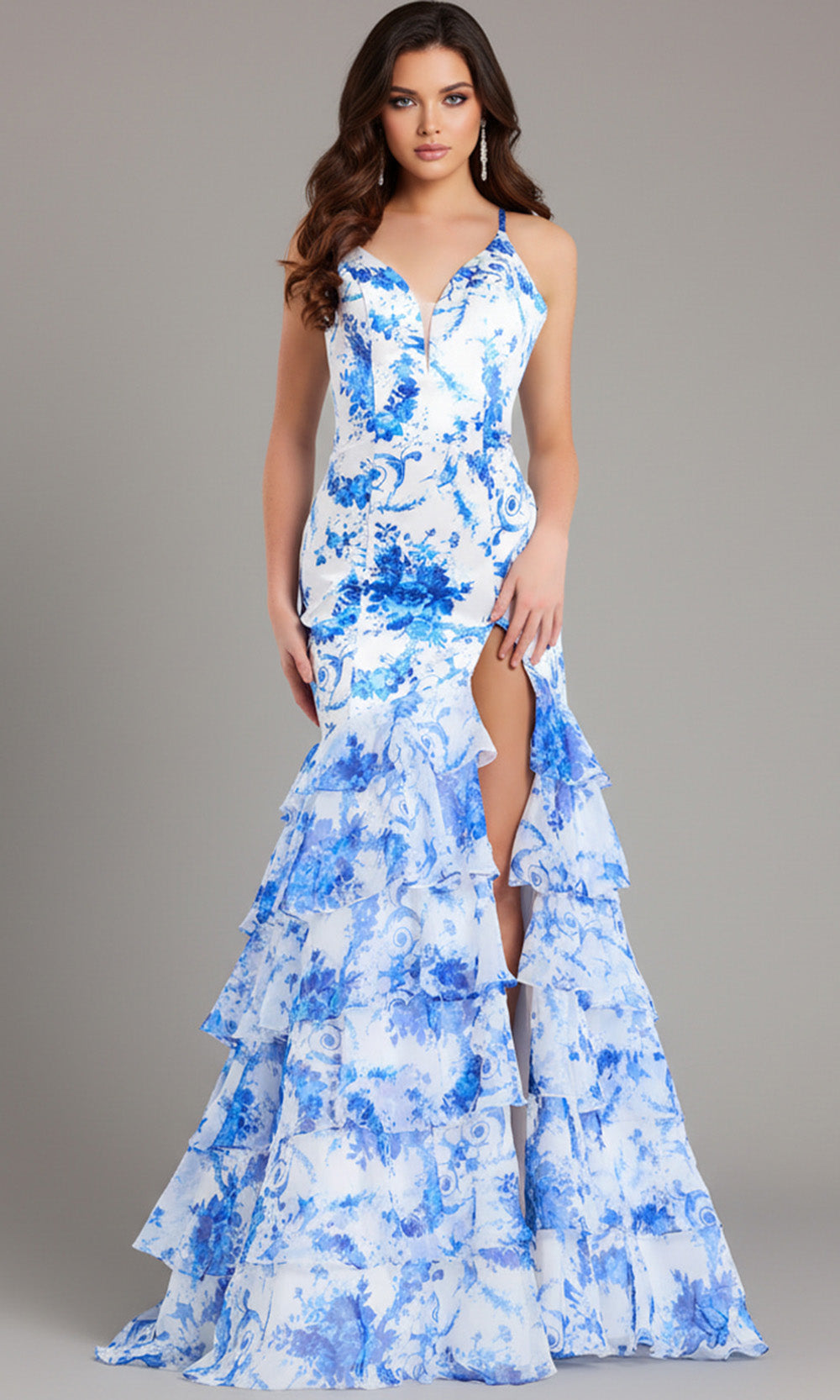 Movement and color intertwine beautifully in Jovani 48331 masterpiece. Its plunging V-neckline elongates the frame while slim spaghetti straps balance the open shoulders. Layer upon layer of soft ruffles give the trumpet skirt dimension, cascading beautifully from hip to hem. A high slit brings a contemporary touch, and the lace-up back ensures a customized fit. The floral print pattern adds vibrancy without overpowering the form, giving the entire piece a refreshing dynamic. Jovani 48331 is perfect for proms or destination celebrations that call for effortless flair. Model is wearing Royal/Print color.