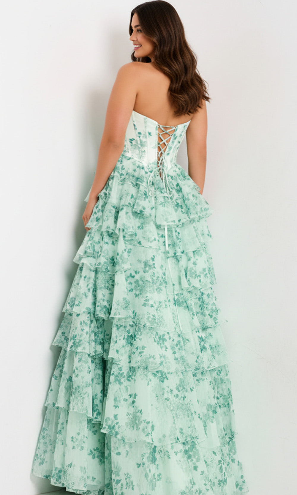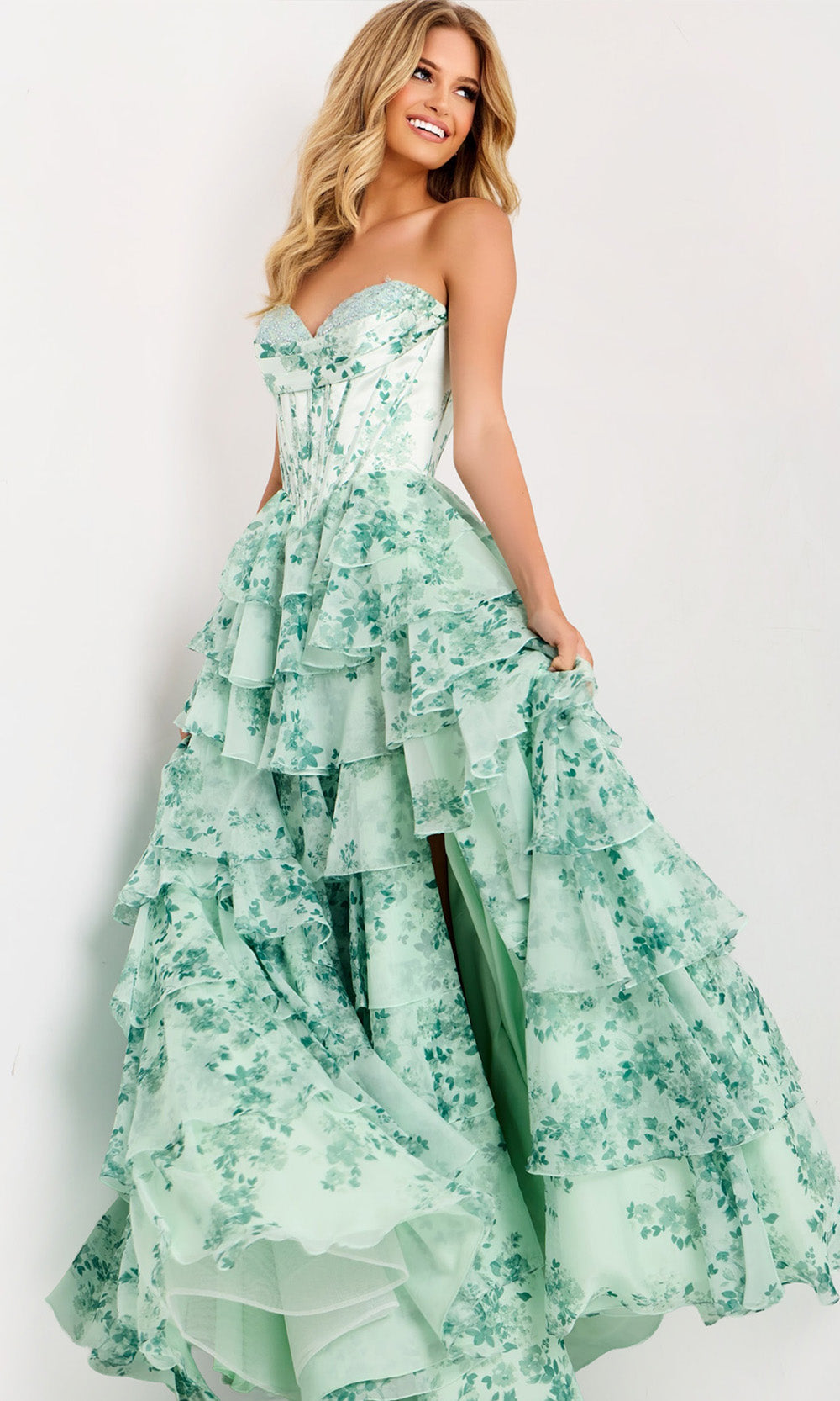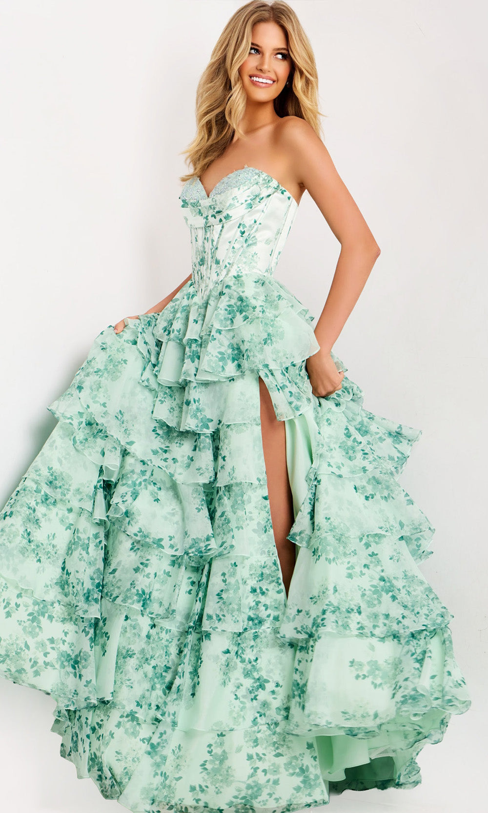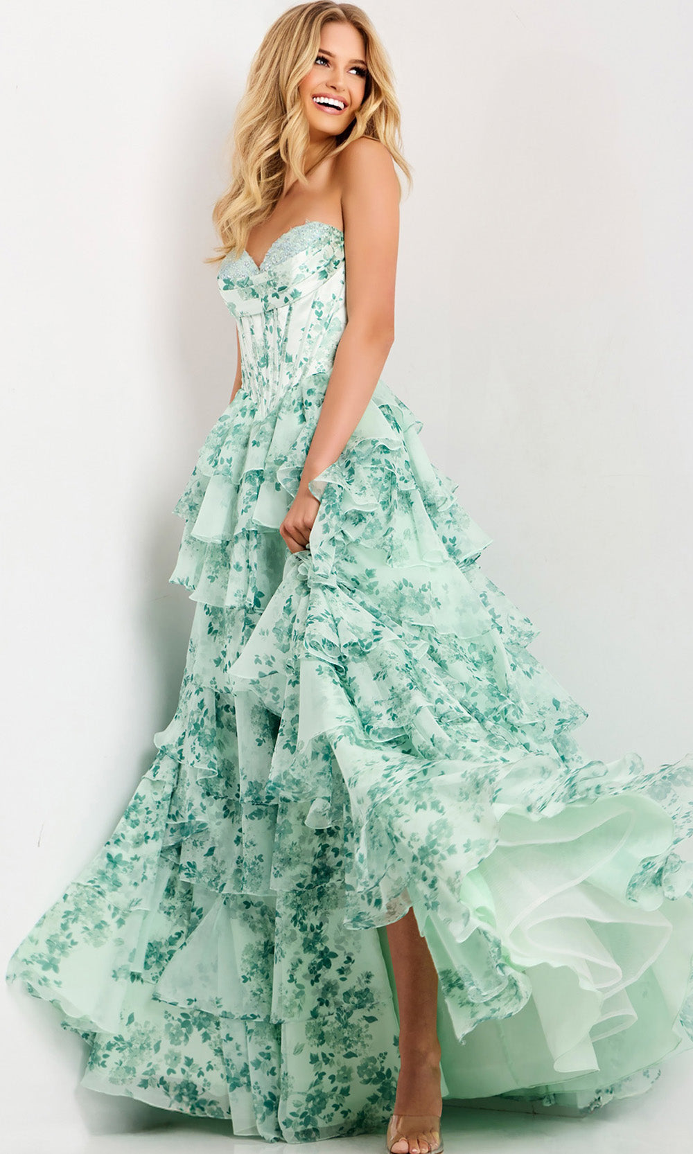 Unveil your inner muse with Jovani 48772, a strapless floral ballgown that captures the spirit of elegance and whimsy. The structured corset bodice accentuates the waist while creating a flattering, romantic silhouette. Layers of cascading ruffles flow beautifully, building volume and movement with every turn. The side slit adds a subtle contrast of boldness, while the lace up back ensures a tailored fit. Perfect for milestone celebrations or grand occasions, Jovani 48772 embodies refined charm, transforming each moment into an unforgettable statement of style and grace. Model is wearing Green/Print color.