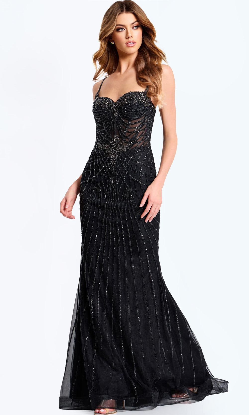 Own the moment in this Jovani 49117 design that exudes charm and undeniable presence. The sweetheart neckline and slender straps shape the shoulders naturally, guiding attention toward the fitted bodice. Beadwork creates a radiant finish, covering sheer mesh that adds depth and dimension to the design. The sheath skirt maintains smooth continuity while extending gracefully to the floor. Jovani 49117 presents a captivating interpretation of texture and proportion, making it an ideal choice for refined celebrations. Model is wearing Black color.