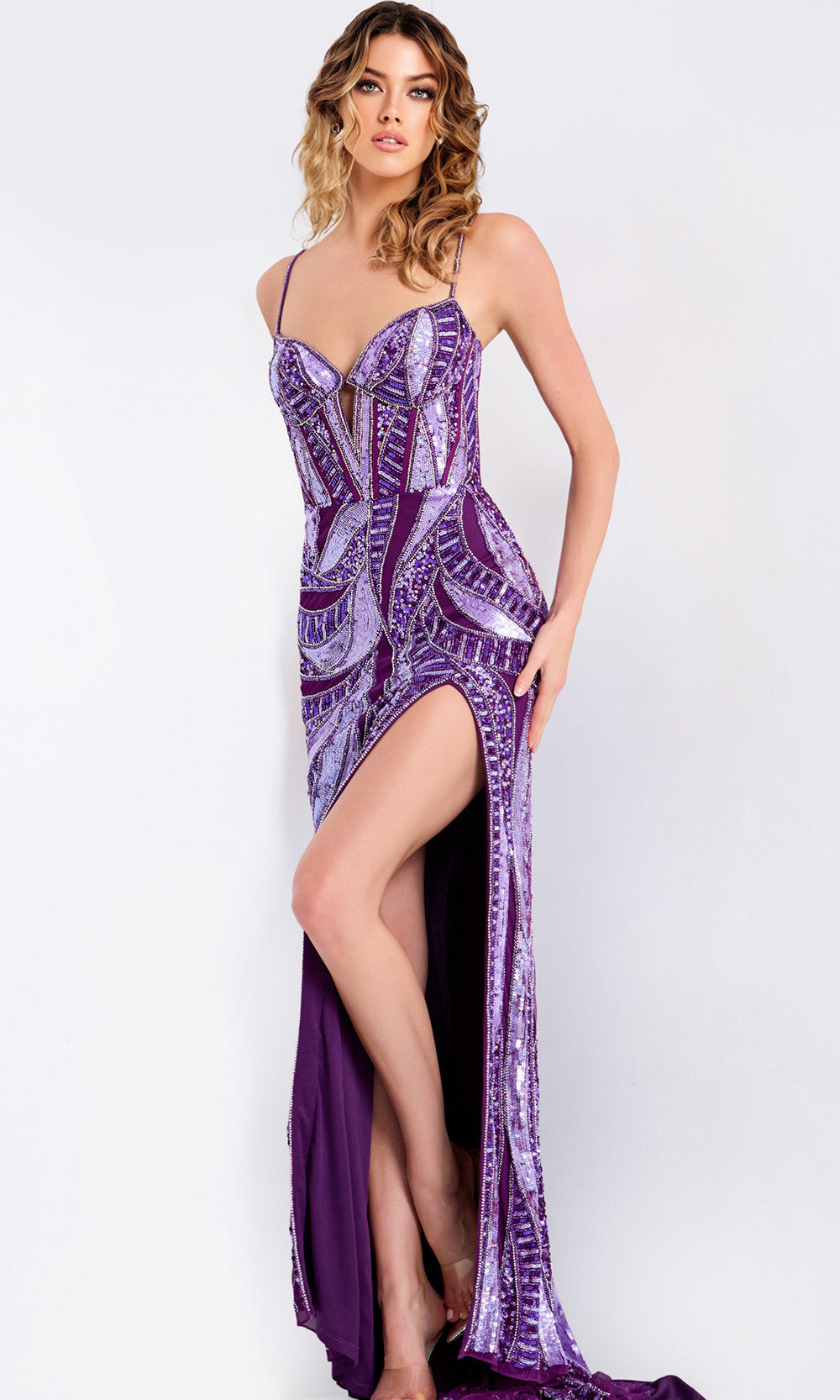 Lights up the moment with a Jovani 49228 showpiece that brings shine and shape together with purpose. Slim straps frame the shoulders as beaded sequin embellishment creates a sleek map that guides the eye through the silhouette. The keyhole cutout adds intrigue at the sweetheart neckline, while the slit offers captivating rhythm in motion. The sheath skirt traces the figure and extends to a floor length hem that flatters every angle. Channel high-fashion energy and make your moment unforgettable in Jovani 49228. Model is wearing Dark Purple Multi color.