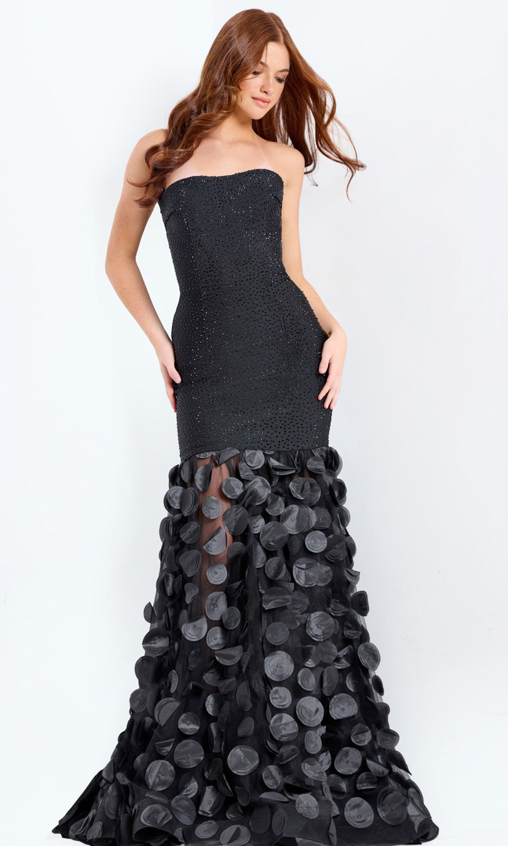 Make lasting impressions wearing Jovani 49344, an extraordinary strapless gown crafted for those who appreciate graceful drama and timeless appeal. The semi-sweetheart neckline enhances the shoulders while the beaded bodice creates a luminous finish. A dramatic sheer skirt cascades with layered circle appliques, bringing rhythm and flow with every step. Perfectly tailored through the waist and hips, the mermaid design ensures a flawless fit. In this Jovani 49344 style, you will capture every glance and own the celebration. Model is wearing Black color.