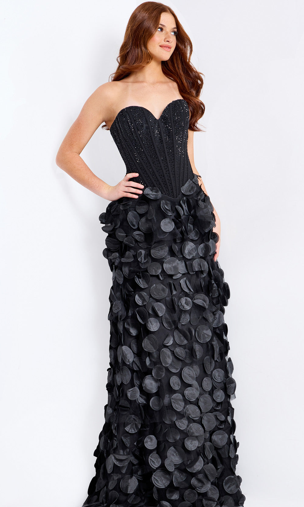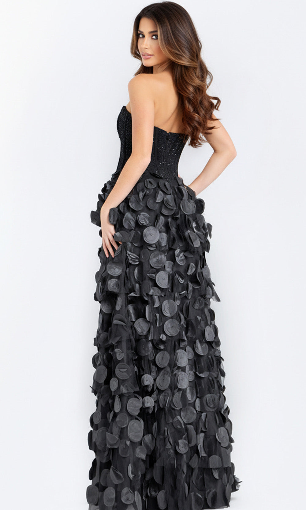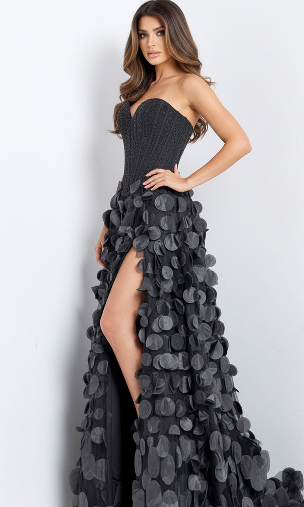 | Details: | Strapless, Beaded Bodice, Corset Top, 3D Petal Skirt, High Slit, Mid-Open Back |