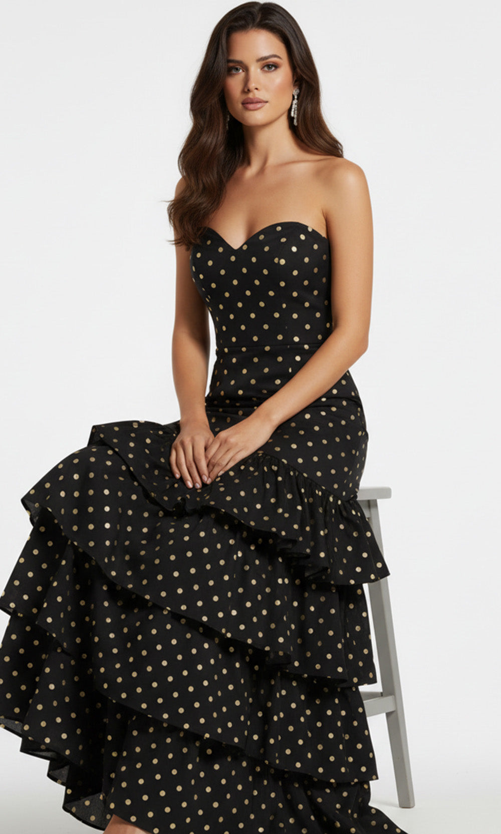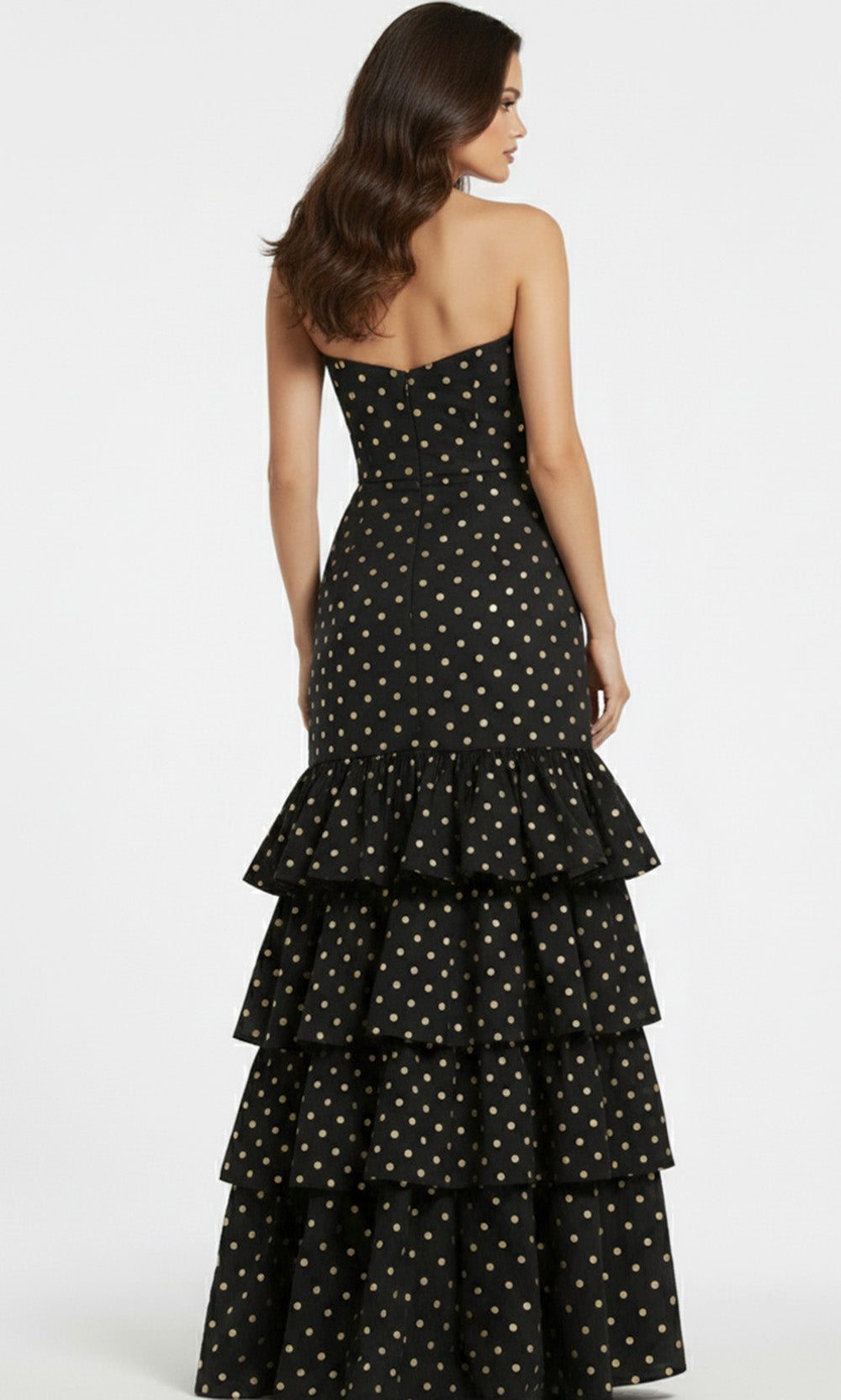 | Details: | Shimmering Polka Dots, Strapless, Tiered Ruffle Skirt, Back Zipper Closure, Sweep Train |