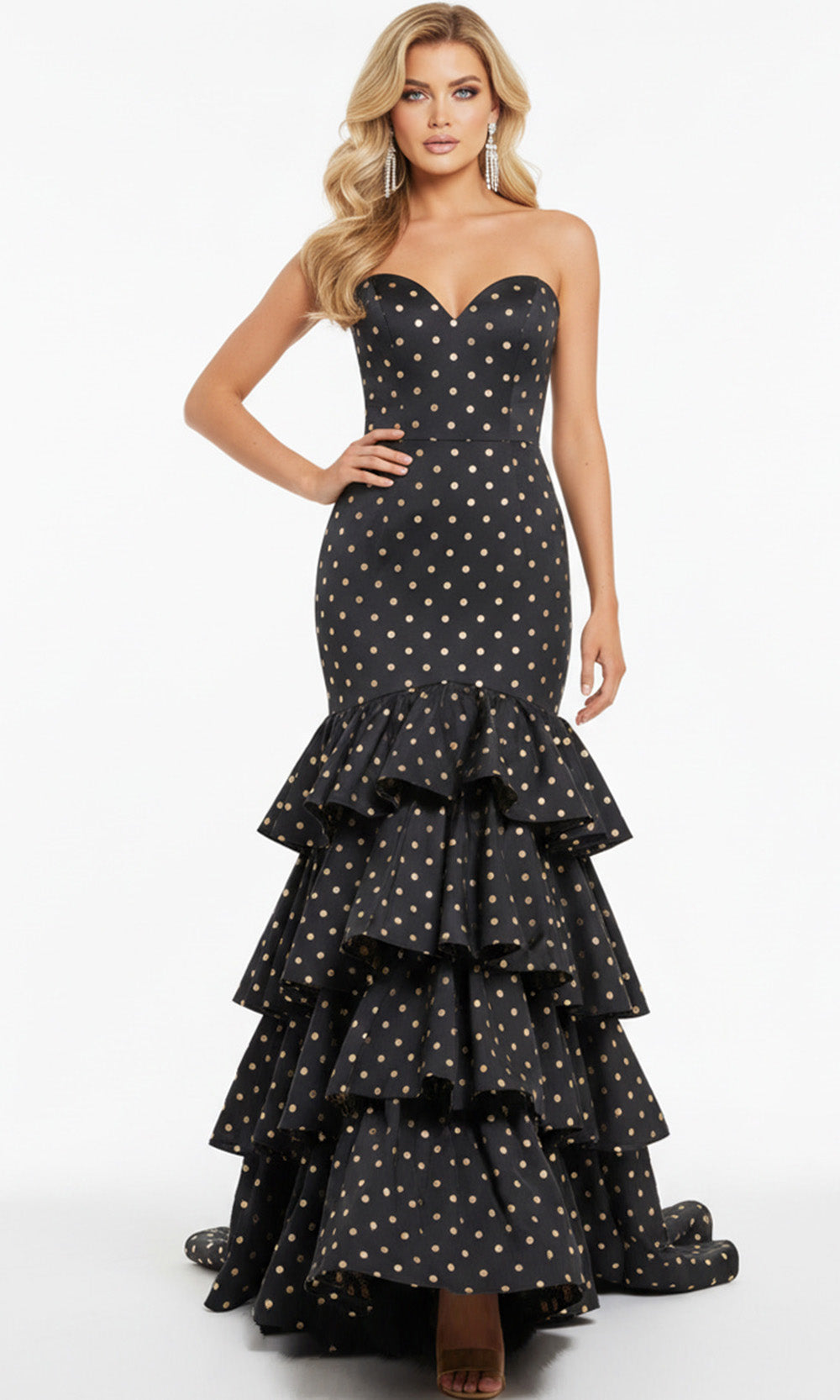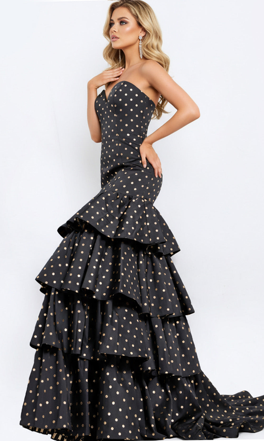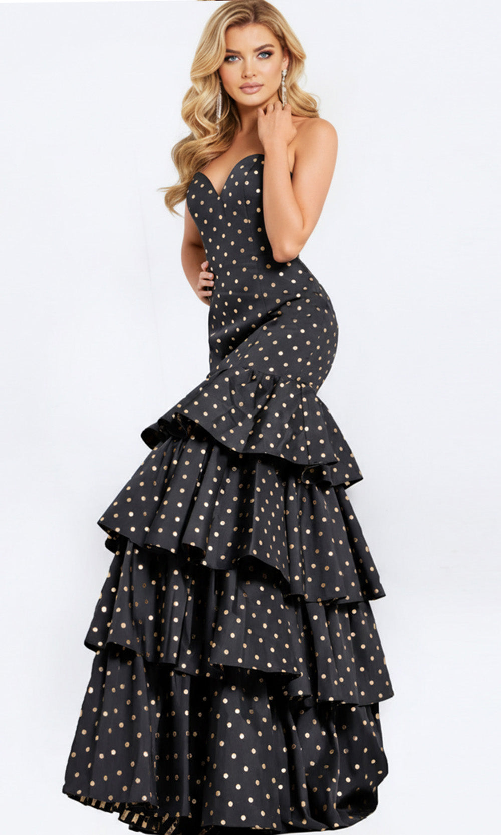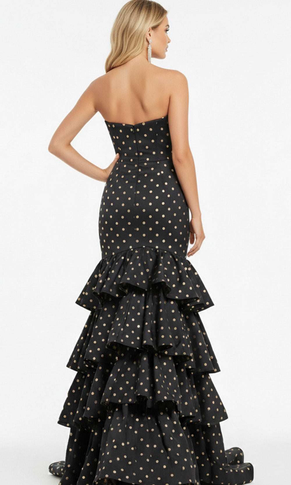 Embodying charm and sophistication, Jovani 49419 mermaid dress brings playful elegance to a timeless silhouette. The sweetheart neckline frames the shoulders beautifully while the fitted bodice enhances the natural waist for a flattering profile. Layered ruffled tiers cascade dramatically, creating volume and dimension that make each step captivating. The polka dot print adds a touch of texture and fun without sacrificing grace or style. Ideal for glamorous evenings or sophisticated gatherings, Jovani 49419 radiates a spirit of joy and refinement designed to stand out beautifully. Model is wearing Black/Gold color.