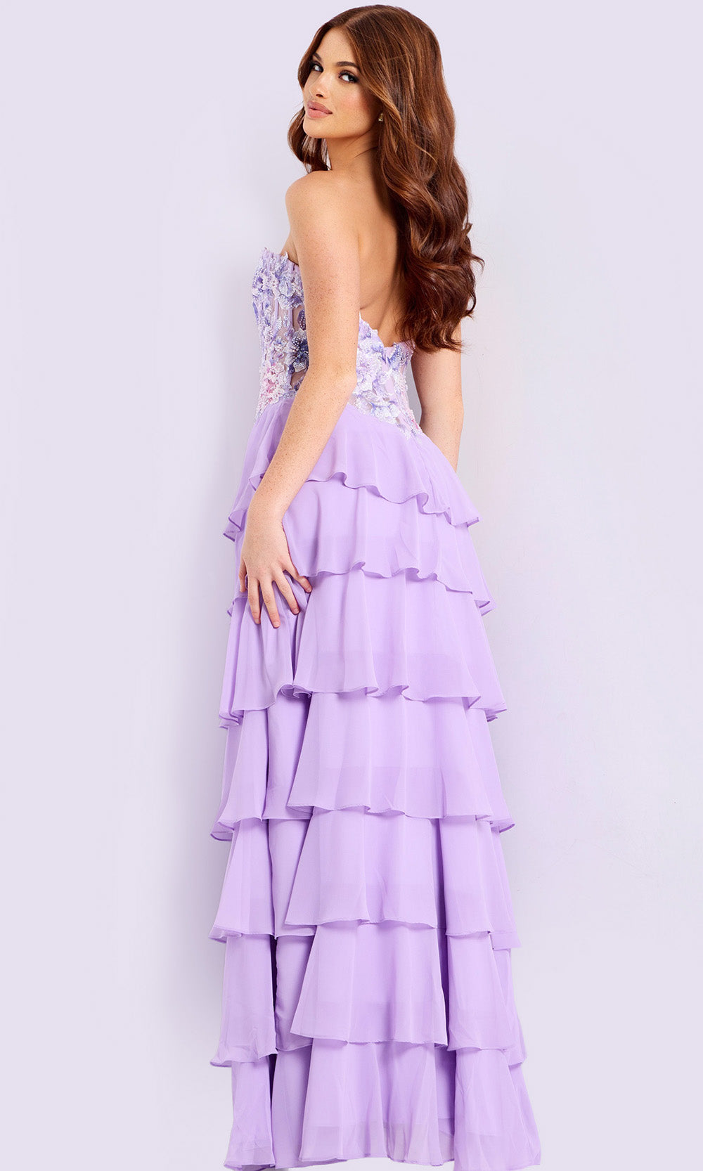 Bring your evening to life in Jovani 49628, a strapless gown made to capture admiration and lasting memories. The sweetheart neckline and illusion corset bodice accentuates the figure, adorned with floral embroidery that adds texture and charm. Flowing ruffle layers create dynamic motion, framing a high slit that reveals a hint of allure. The Basque waistline complements the cascading chiffon A-line skirt, completing the look with a graceful flow. This Jovani 49628 creation ensures a remarkable presence at every special celebration. Model is wearing Lilac color.
