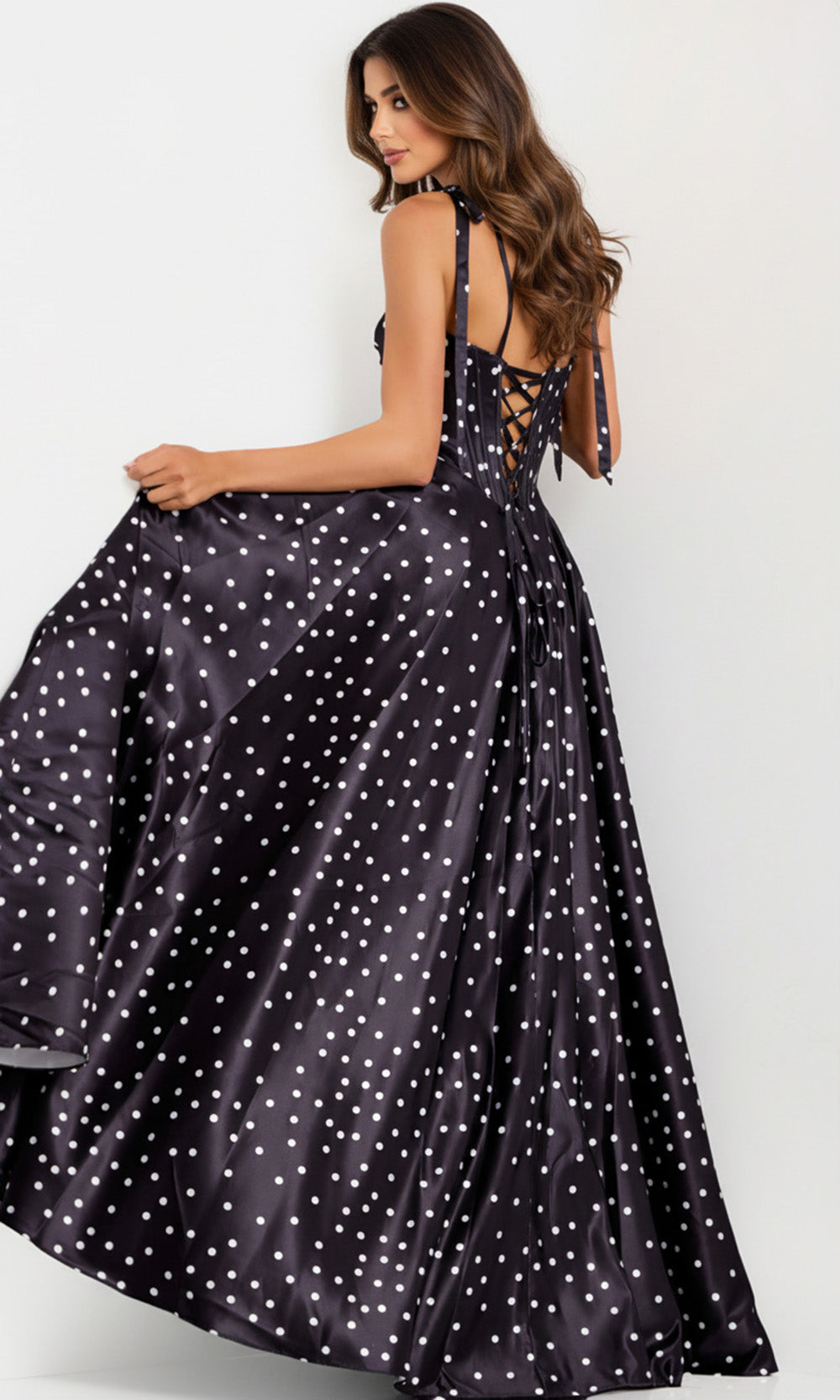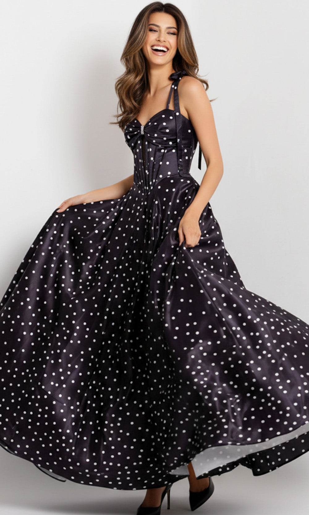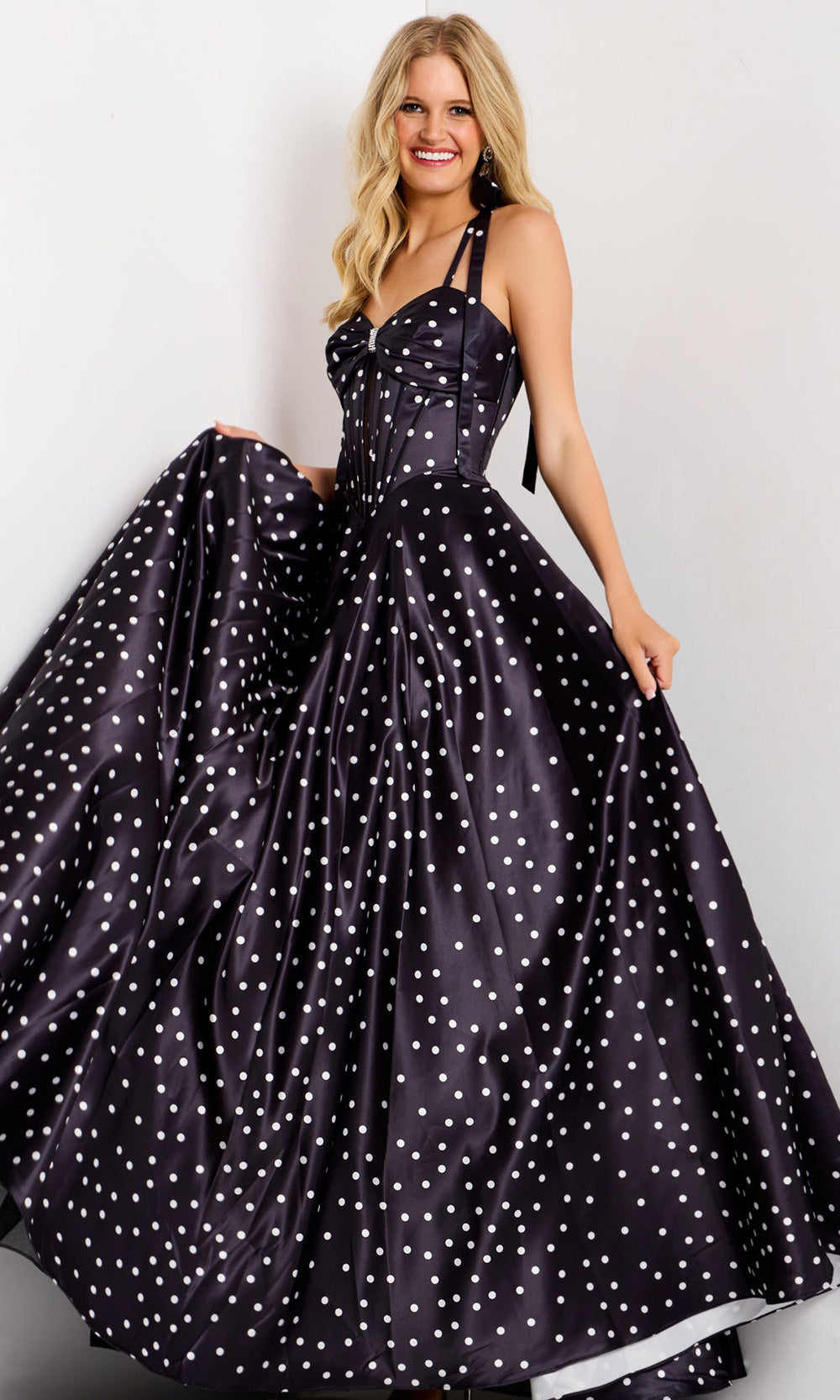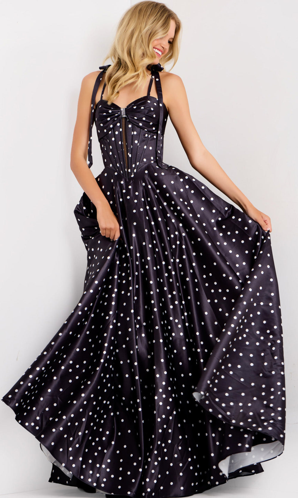 A blend of vintage charm and modern elegance brings Jovani 49774 to life in an unforgettable way. Its tie spaghetti straps frame the shoulders, while the exposed boning in the corset bodice creates a graceful structure that flatters the figure. A beaded brooch accent highlights the bow-inspired sweetheart neckline, complemented by an A-line skirt embellished with delightful polka dots. Crafted to capture attention with poise and sophistication, Jovani 49774 turns any evening into an occasion filled with classic allure and timeless beauty.