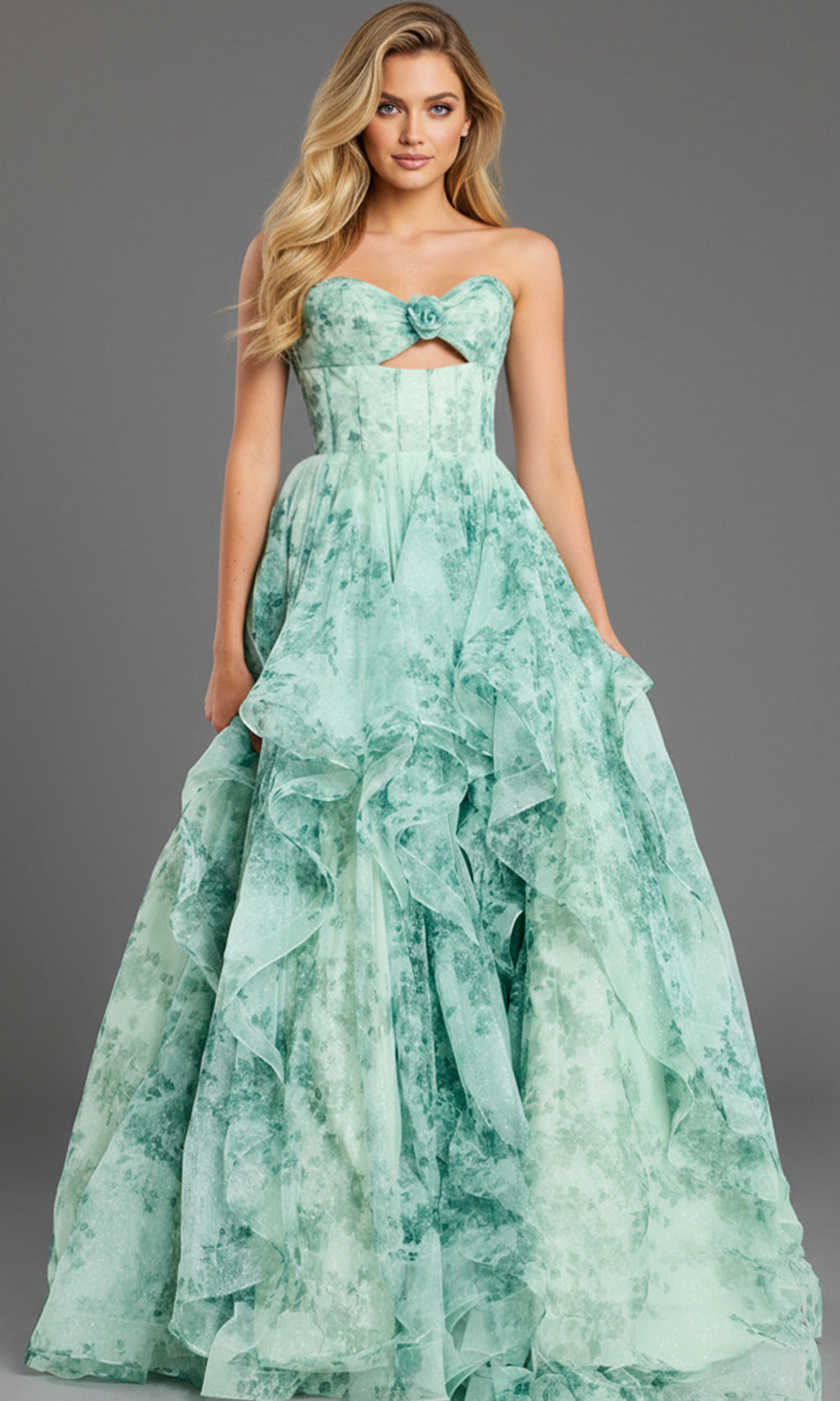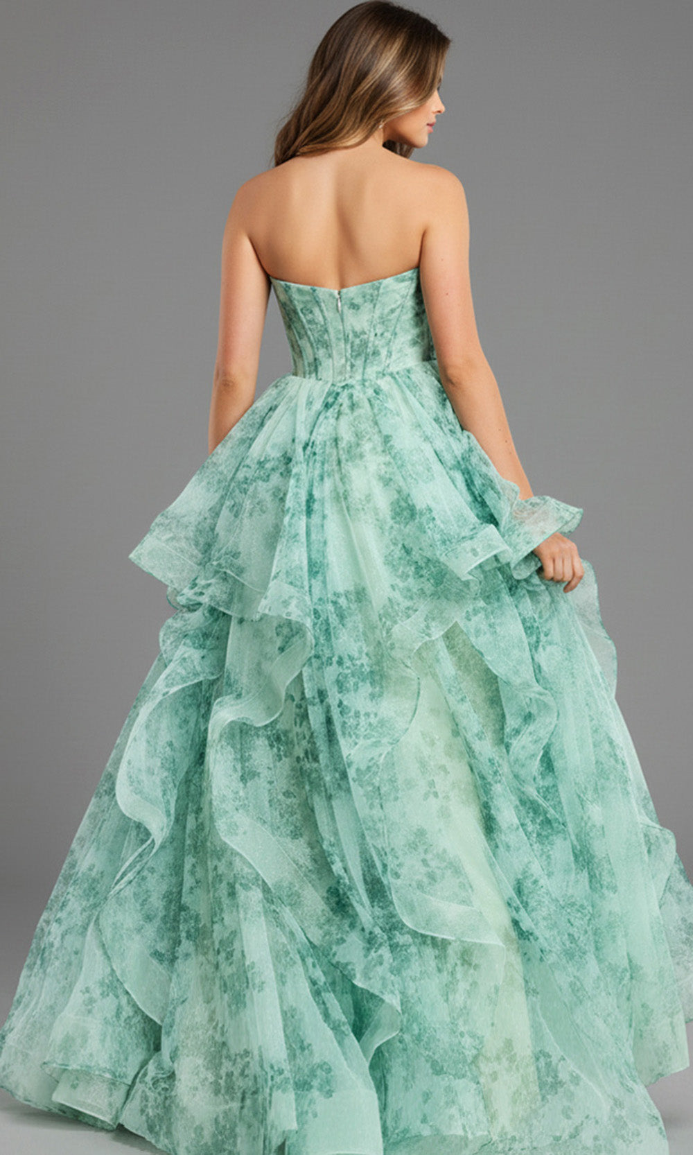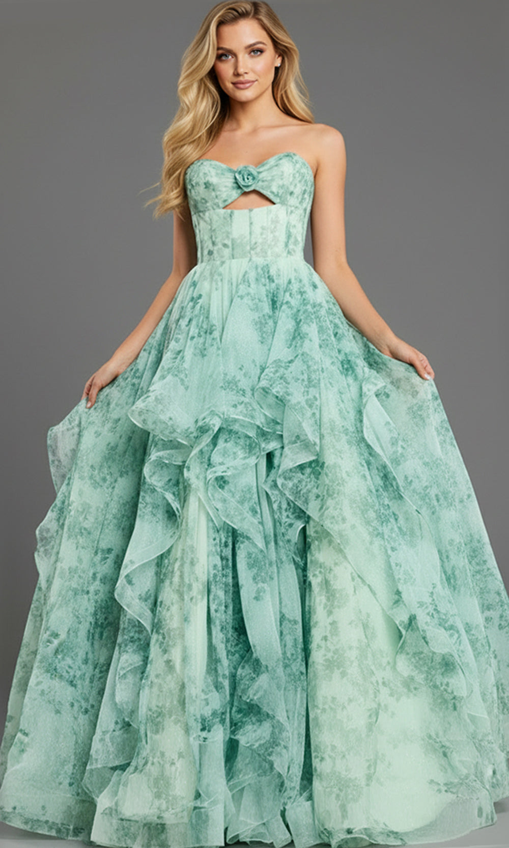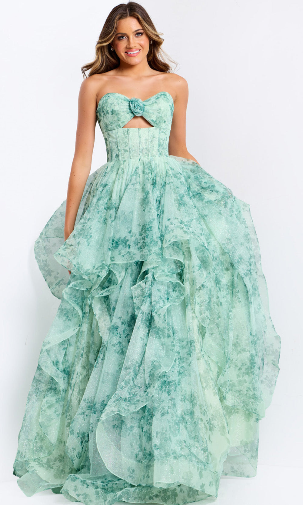 Romantic design and modern volume unite in this enchanting strapless gown from Jovani 49777. The ruched bodice cinches the waist while a subtle cutout adds a contemporary twist to the timeless shape. Layers of ruffled fabric create a cascading A-line skirt that moves beautifully with every step. A delicate floral accent at the sweetheart neckline ties the look together with a graceful finish. Jovani 49777 embodies dreamlike beauty and exceptional craftsmanship, presenting an unforgettable gown that brings a sense of magic to any special occasion. Model is wearing Green/Print color.