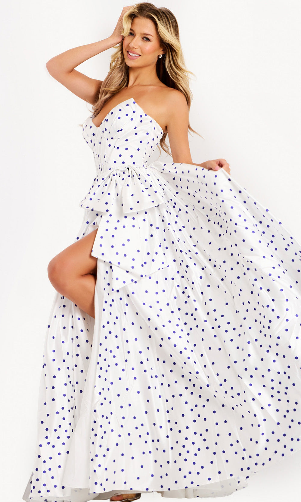 Playful charm finds its perfect expression in Jovani 49899, an enchanting ballgown with modern refinement. The strapless v-neckline highlights the shoulders, while the structured corset bodice creates an elegant foundation. A full skirt flows gracefully to the floor, detailed with a daring slit for added allure. The bow accent at the waist offers a refined focal point. With its polka dot pattern adding texture and personality, Jovani 49899 transforms any formal event into a moment of grace and polished sophistication. Model is wearing Off White/Royal color.