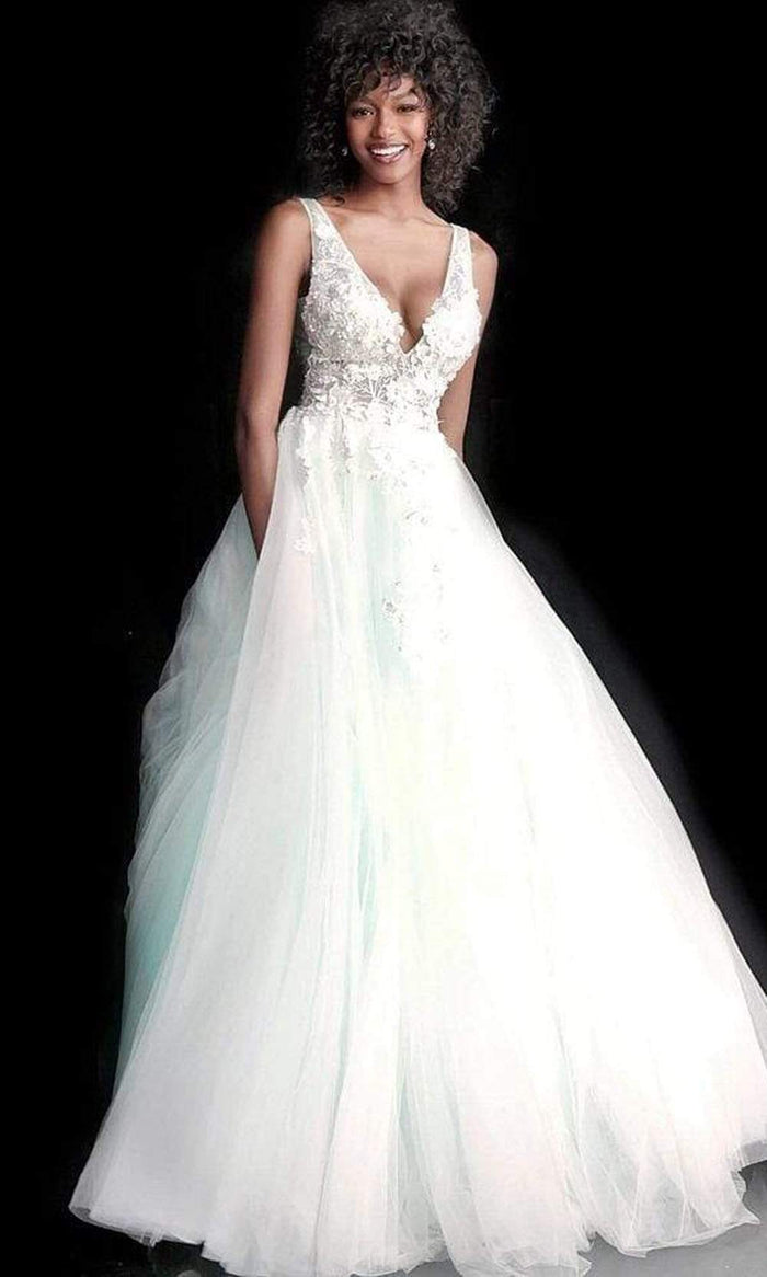 Get noticed in this fantastic evening gown by Jovani 55634 Dress. This sleeveless dress boasts a V-neckline with ornate floral applique at the structured bodice. This dress has a nipped waist with a flowing sheer tulle skirt. The ball gown skirt has swatches of floral applique cascades from the midriff. This gown finishes with a full length hem. What an outstanding choice for prom, easy to dance in and you get to look like a princess wearing a Jovani piece.