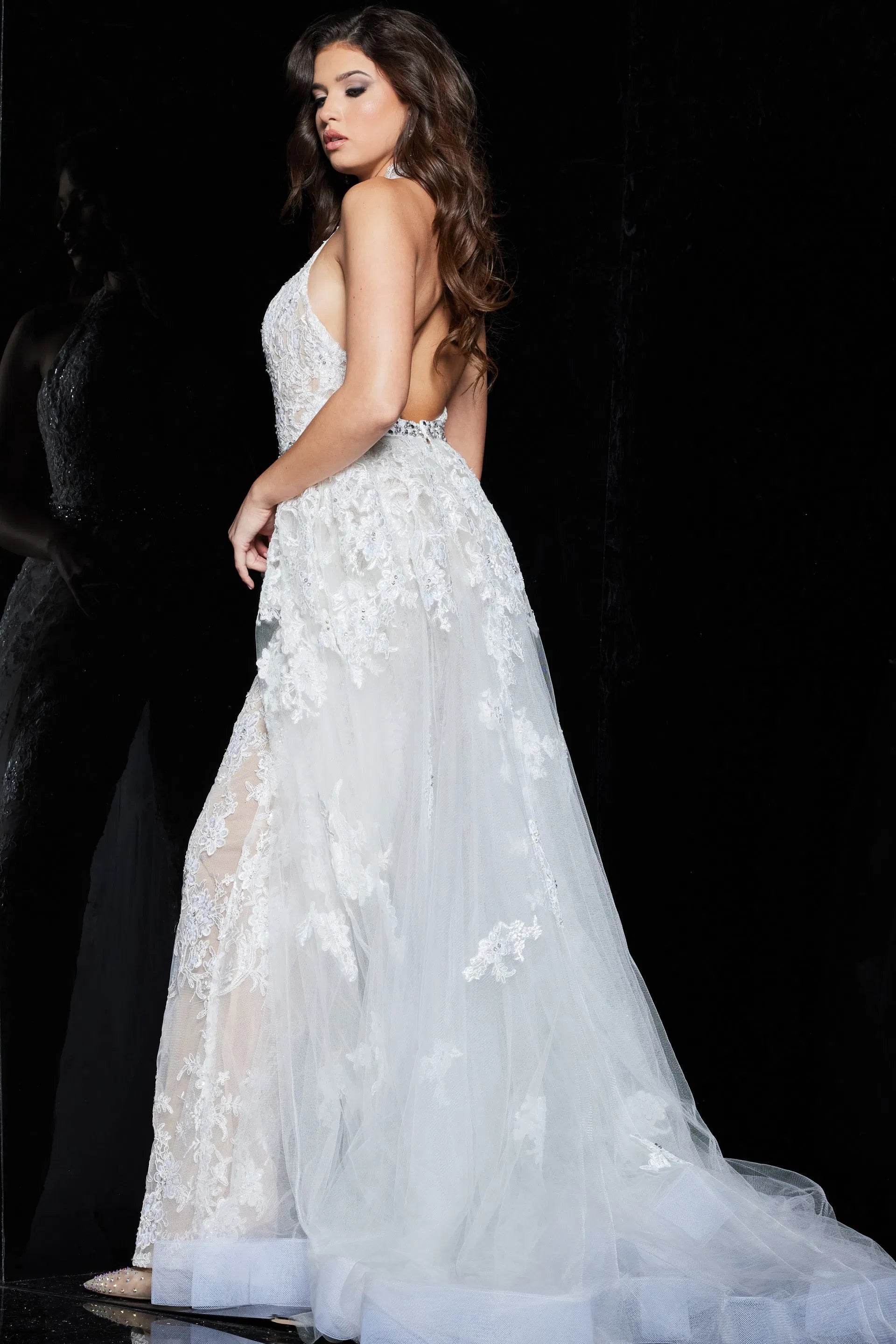 | Details: | Sleeveless, Invisible back zipper, Lace, scalloped lining, Open back, Embellished waist, Straight leg pants, Detachable sheer overskirt |