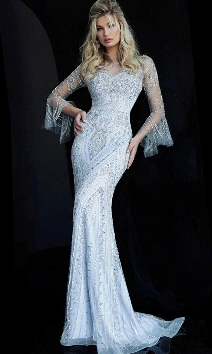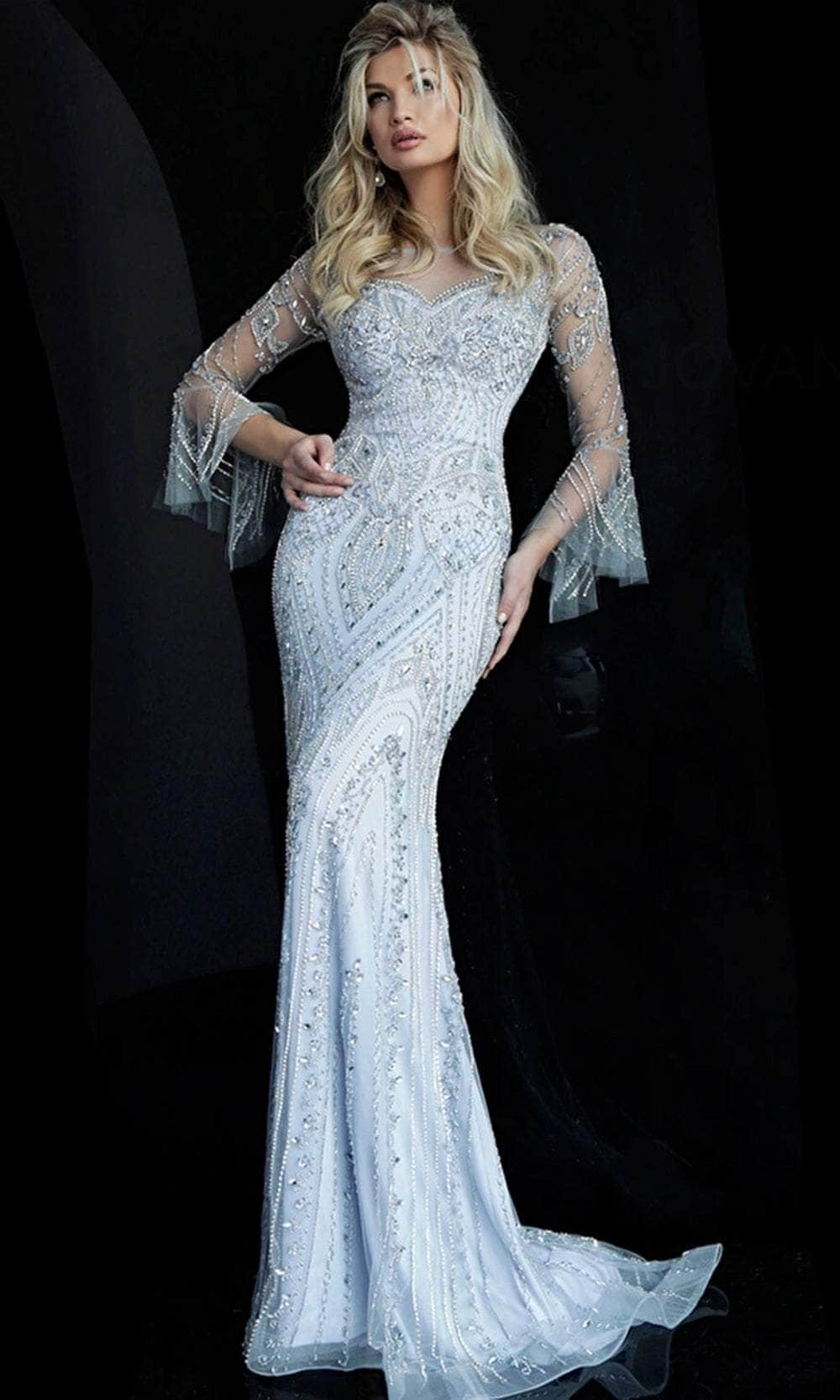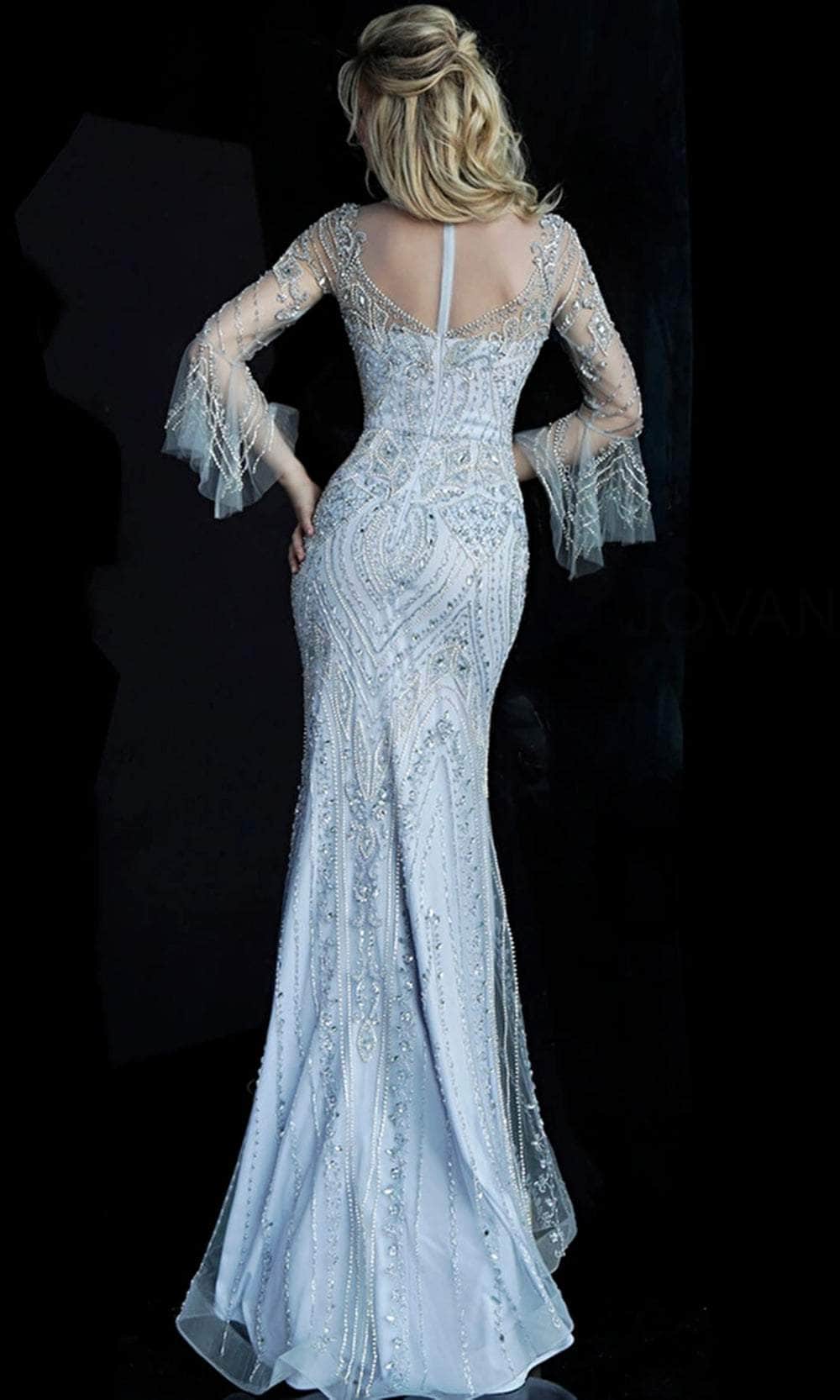 Embody Hollywood glitz and glamour in this sparkly number from Jovani 60827. This elegant formal dress has a sheath silhouette, with an illusion neckline and sheer details that are intricately crystal beaded all throughout. The dress features a sheer bell shaped sleeves that is beaded with various patterns of lines and figures. It also has a sheer open back that is also beaded with patterns of curves with a full back zipper. This elegant dress would make a luxurious mother of the bride or groom dress. Model is wearing Grey. Find more mother of the bride dresses.